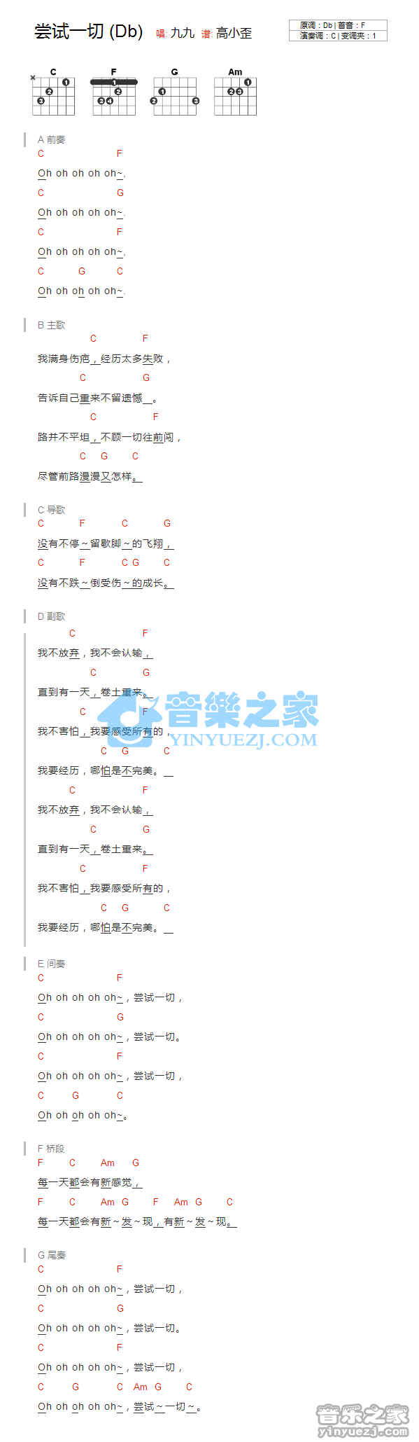 吉他九九《尝试一切》吉他谱_吉他弹唱谱_YYZJ编配