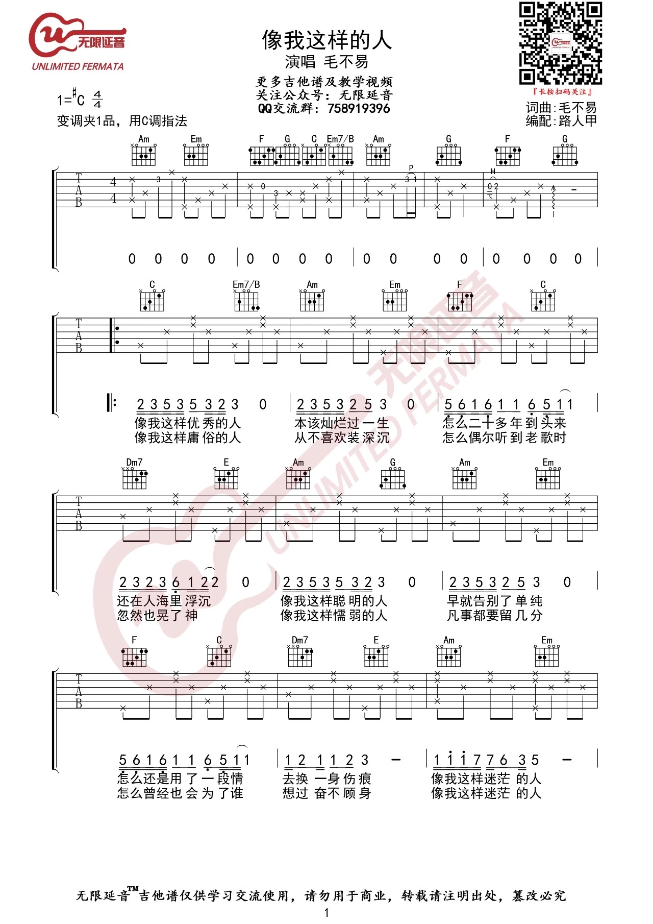 毛不易《像我这样的人》吉他谱,共有2张高清图谱,免翻页排版设计。...