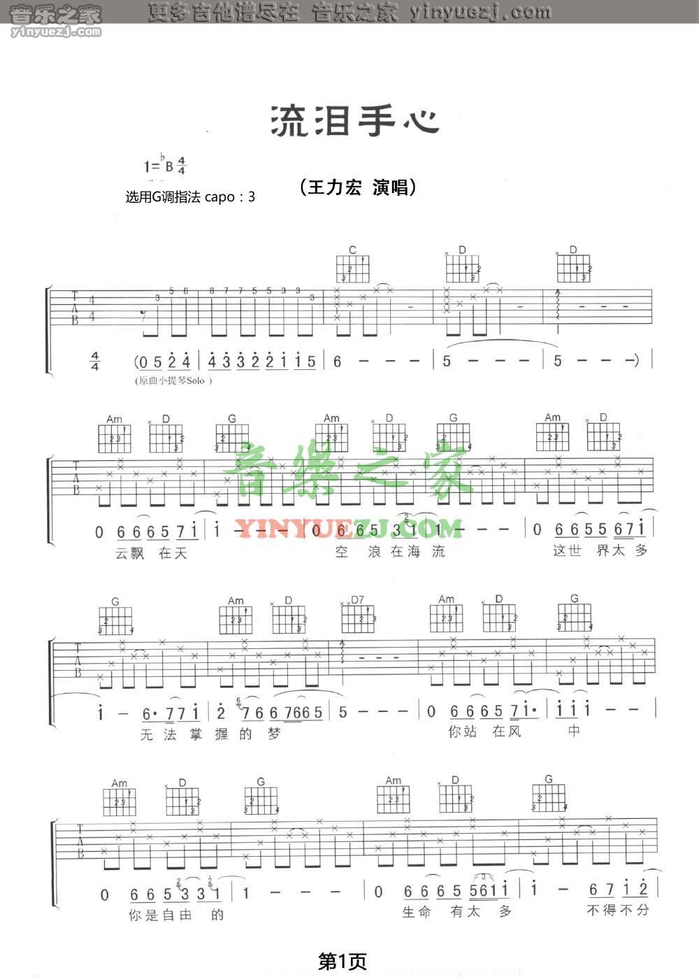 王力宏《流泪手心》吉他谱,YYZJ编配出品,共有4张高清图谱。...