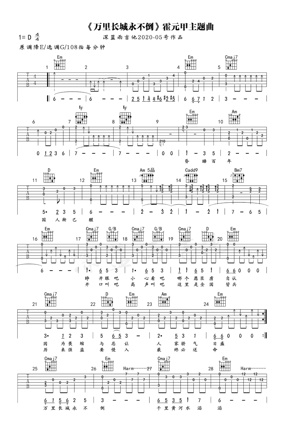 吉他叶振棠《万里长城永不倒》吉他谱_吉他指弹六线谱_深蓝雨吉他编配