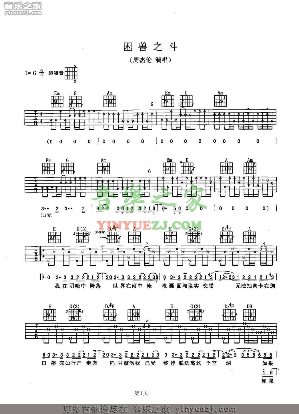 吉他周杰伦《困兽之斗》吉他谱_吉他弹唱谱_YYZJ编配