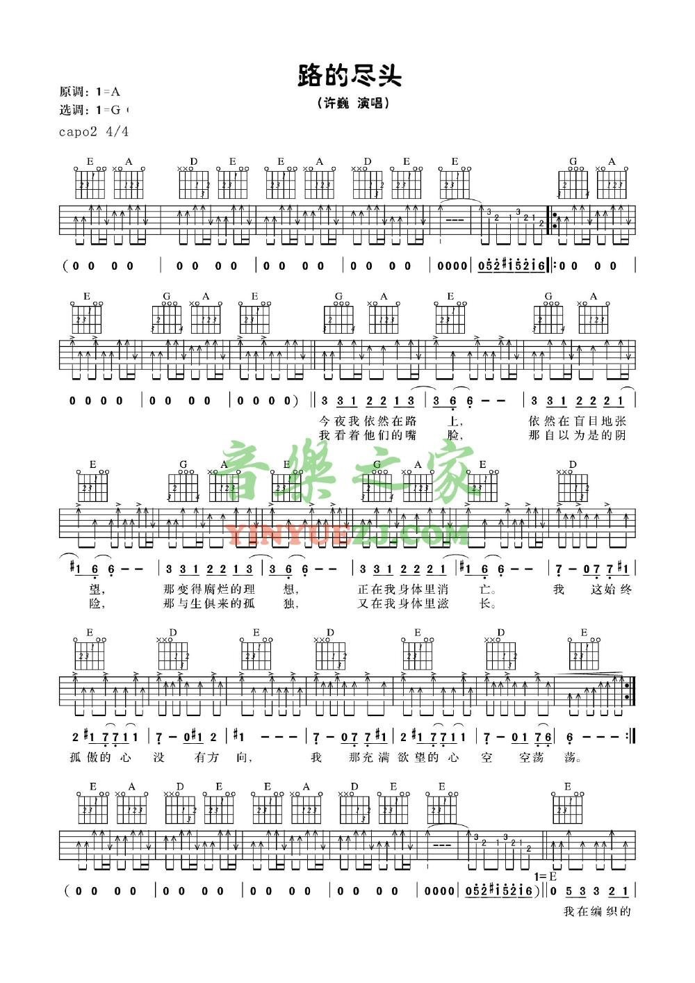 吉他许巍《路的尽头》吉他谱_吉他弹唱谱_YYZJ编配
