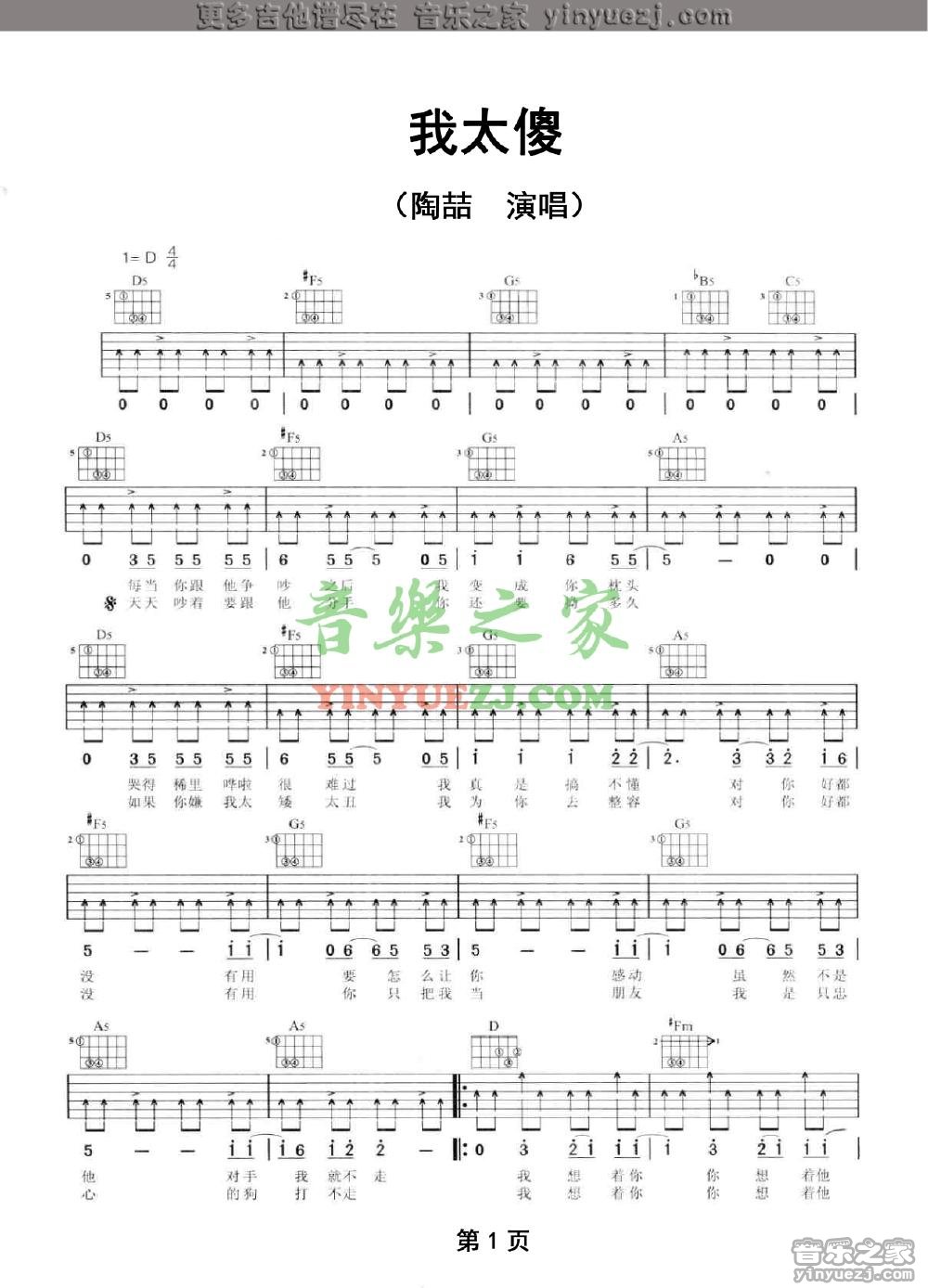 陶喆《我太傻》吉他谱,YYZJ编配出品,共有2张高清图谱,免翻页排版设计。...