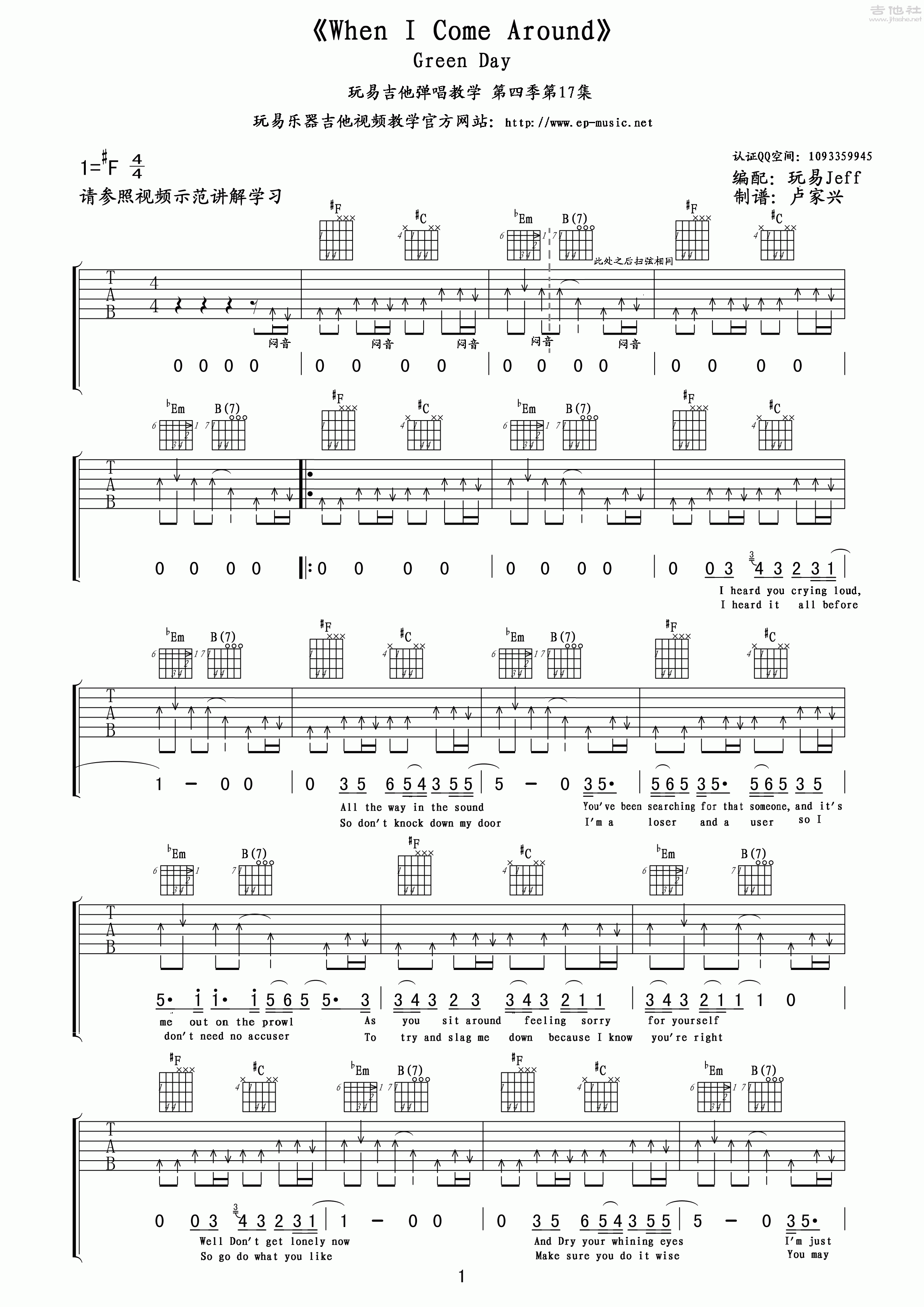 greenDAY《WhenIComeAround》吉他谱,玩易编配出品,共有2张高清图谱,免翻页排版设计。...