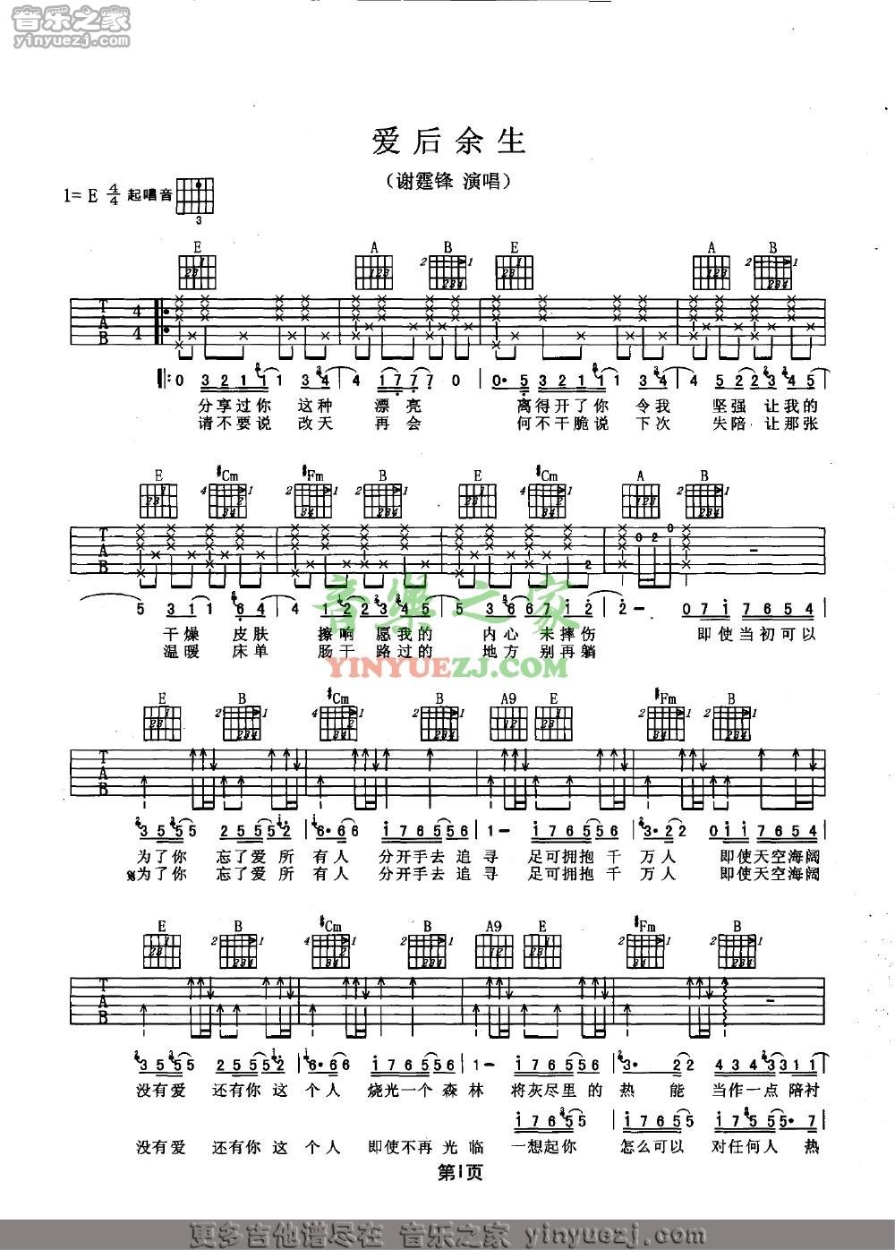 吉他谢霆锋《爱后余生》吉他谱_吉他弹唱谱_YYZJ编配