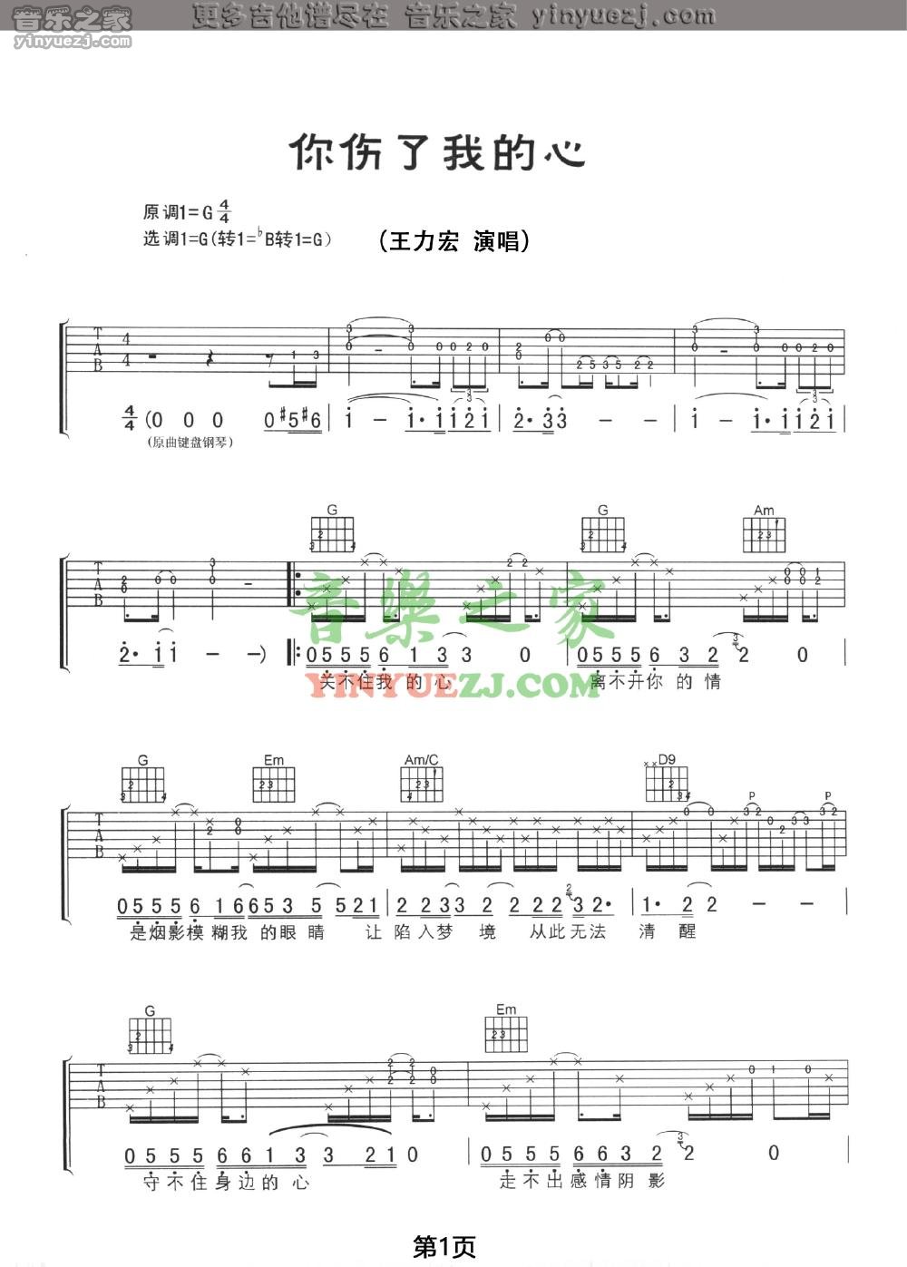 王力宏《你伤了我的心》吉他谱,YYZJ编配出品,共有3张高清图谱。...