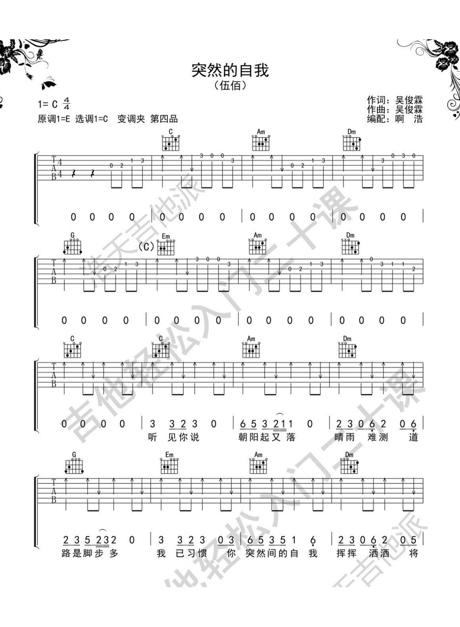 伍佰《突然的自我》吉他谱,啊浩编配出品,共有3张高清图谱。...