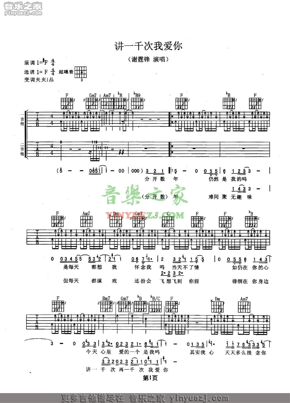 谢霆锋《讲一千次我爱你》吉他谱,YYZJ编配出品,共有2张高清图谱,免翻页排版设计。...
