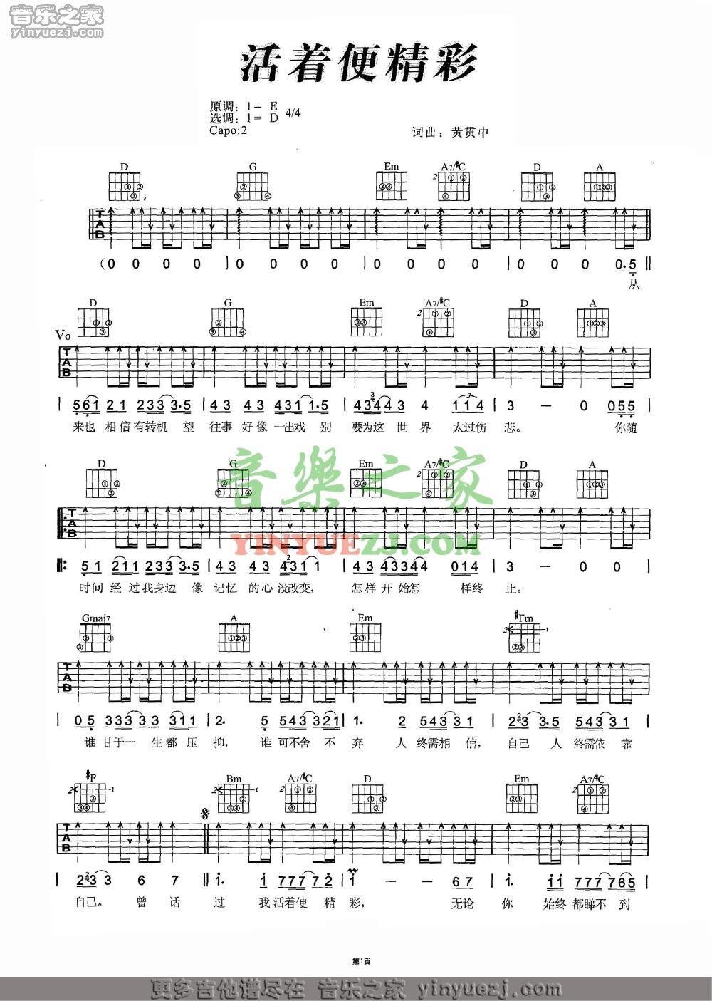 吉他Beyond《活着便精彩》吉他谱_吉他弹唱谱_YYZJ编配