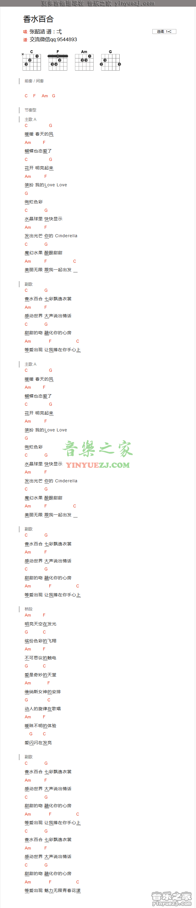 吉他张韶涵《香水百合》吉他谱_吉他弹唱谱_YYZJ编配