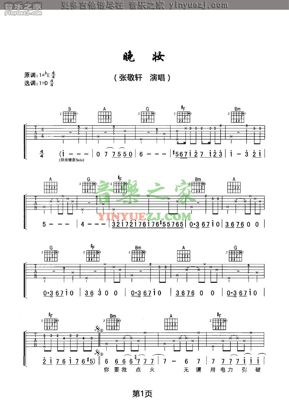 张敬轩《晚妆》吉他谱,YYZJ编配出品,共有4张高清图谱。...