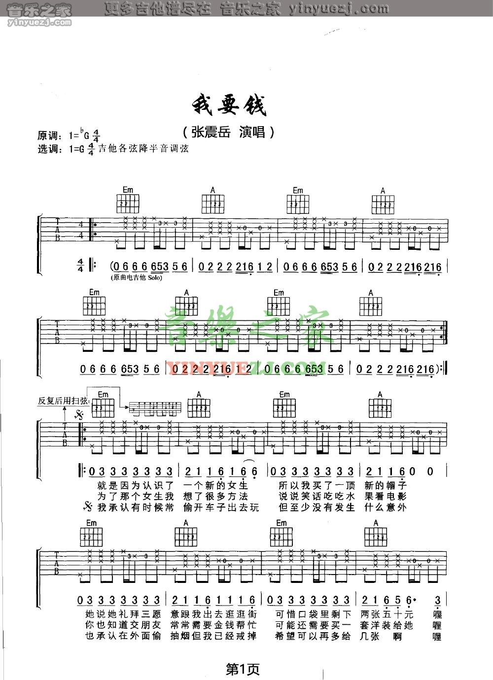 吉他张震岳《我要钱》吉他谱_吉他弹唱谱_YYZJ编配