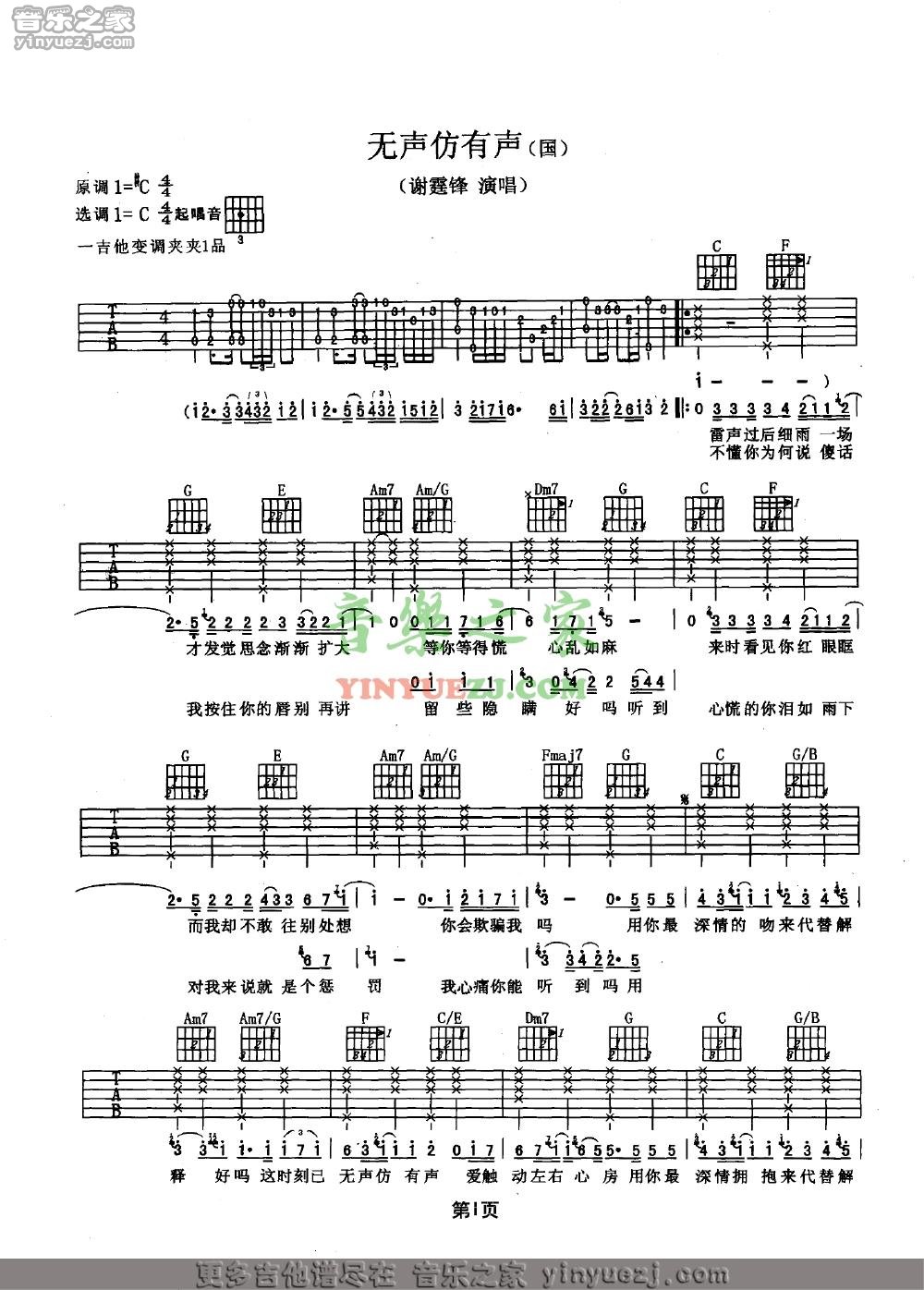 谢霆锋《无声仿有声》吉他谱,YYZJ编配出品,共有2张高清图谱,免翻页排版设计。...