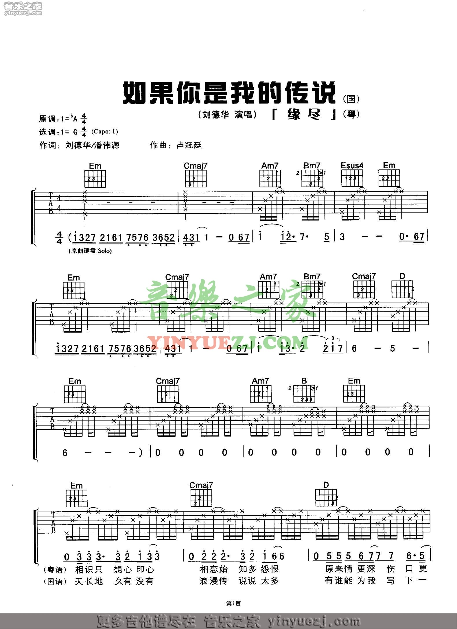 吉他刘德华《如果你是我的传说》吉他谱_吉他弹唱谱_YYZJ编配