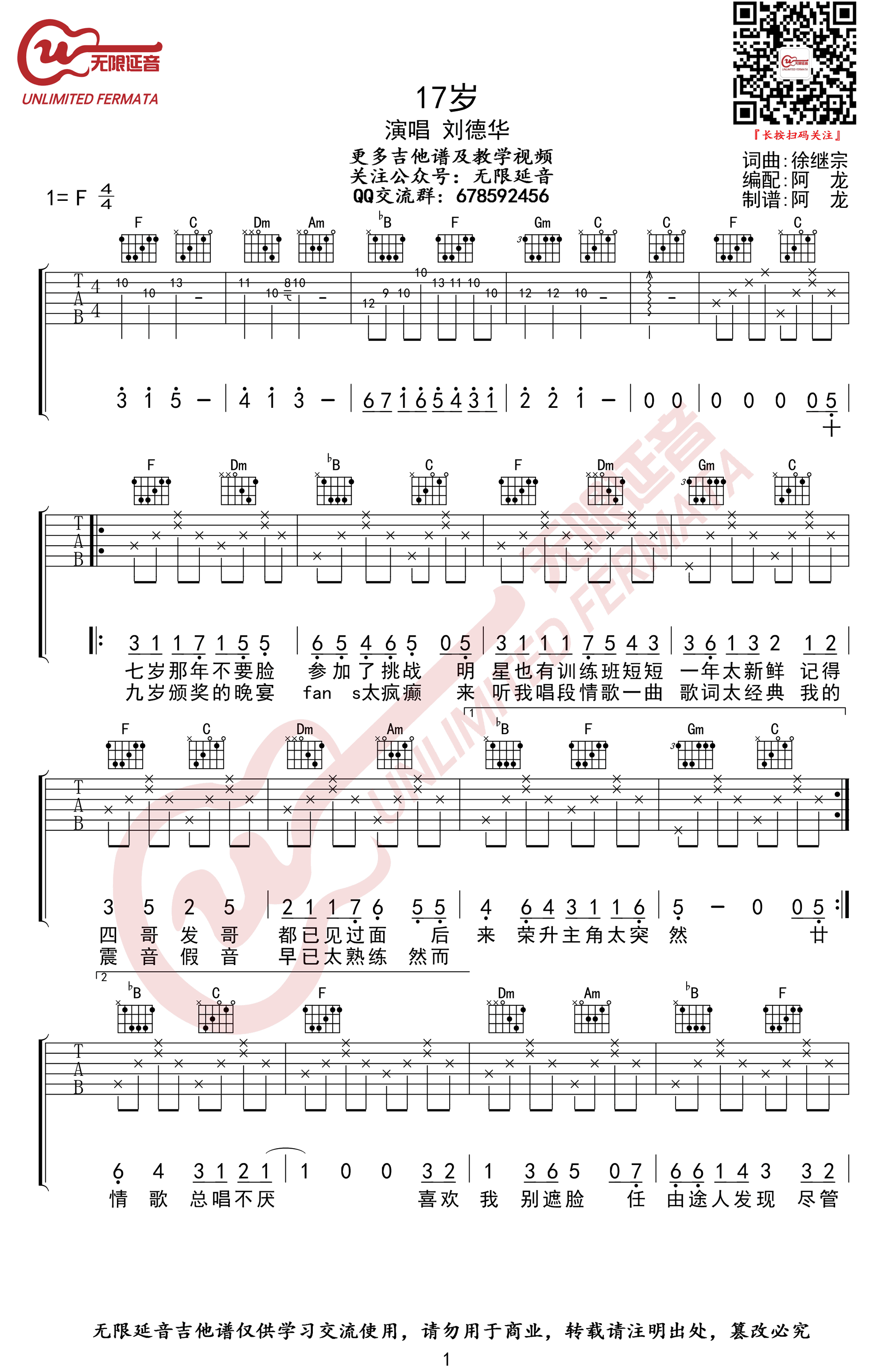 刘德华《十七岁》吉他谱,无限延音编配出品,共有3张高清图谱。...