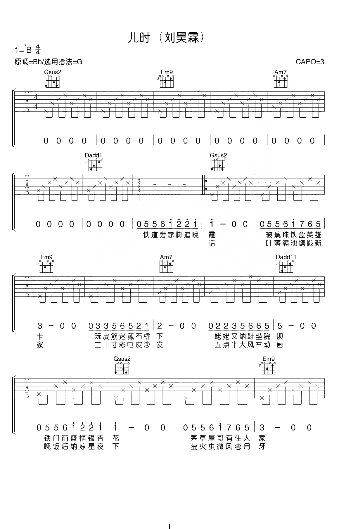 儿时吉他谱,刘昊霖演唱,原调降B,选用G调指法,《儿时》这首介于民谣与流行之间的曲目,一直受到广大琴友的喜爱,可能是曲中的歌词比较有诗意,亦或是唱调委婉优美,都可以给大家留下深刻的印象!老师编配的这个乐谱是纯原版的!原版配器当中大量凸显吉他的音色,故而乐谱的效果和原版是非常贴近的...