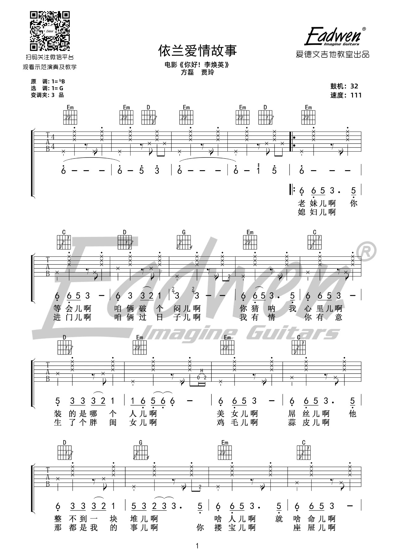 方磊《伊兰爱情故事》吉他谱,爱德文吉他教室编配出品,共有4张高清图谱。...