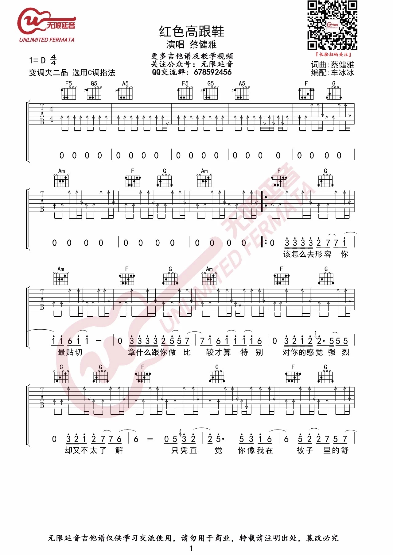 蔡健雅《红色高跟鞋》吉他谱,无限延音编配出品,共有3张高清图谱。...
