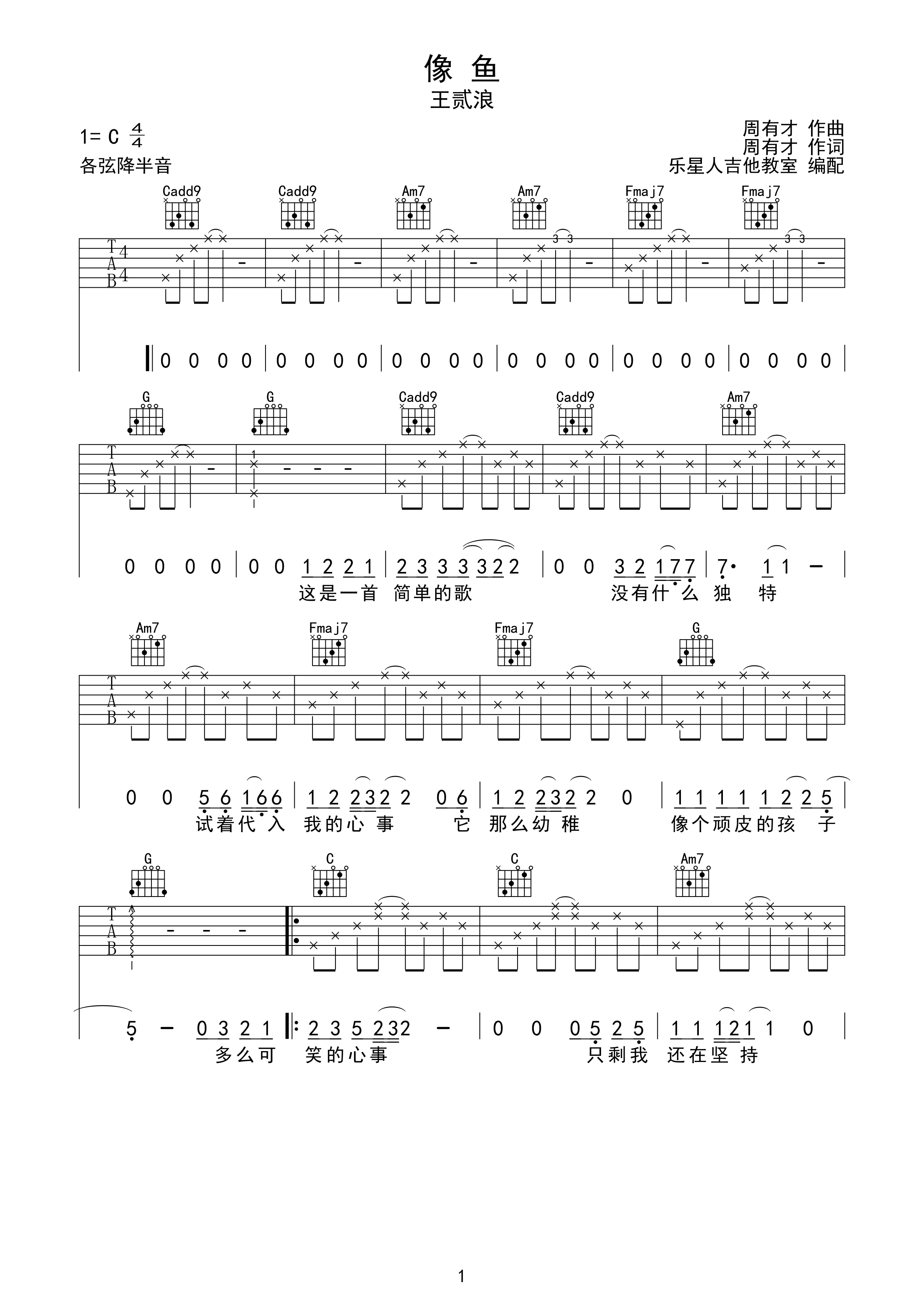 王贰浪《像鱼》吉他谱,乐星人吉他教室编配出品,共有3张高清图谱。...