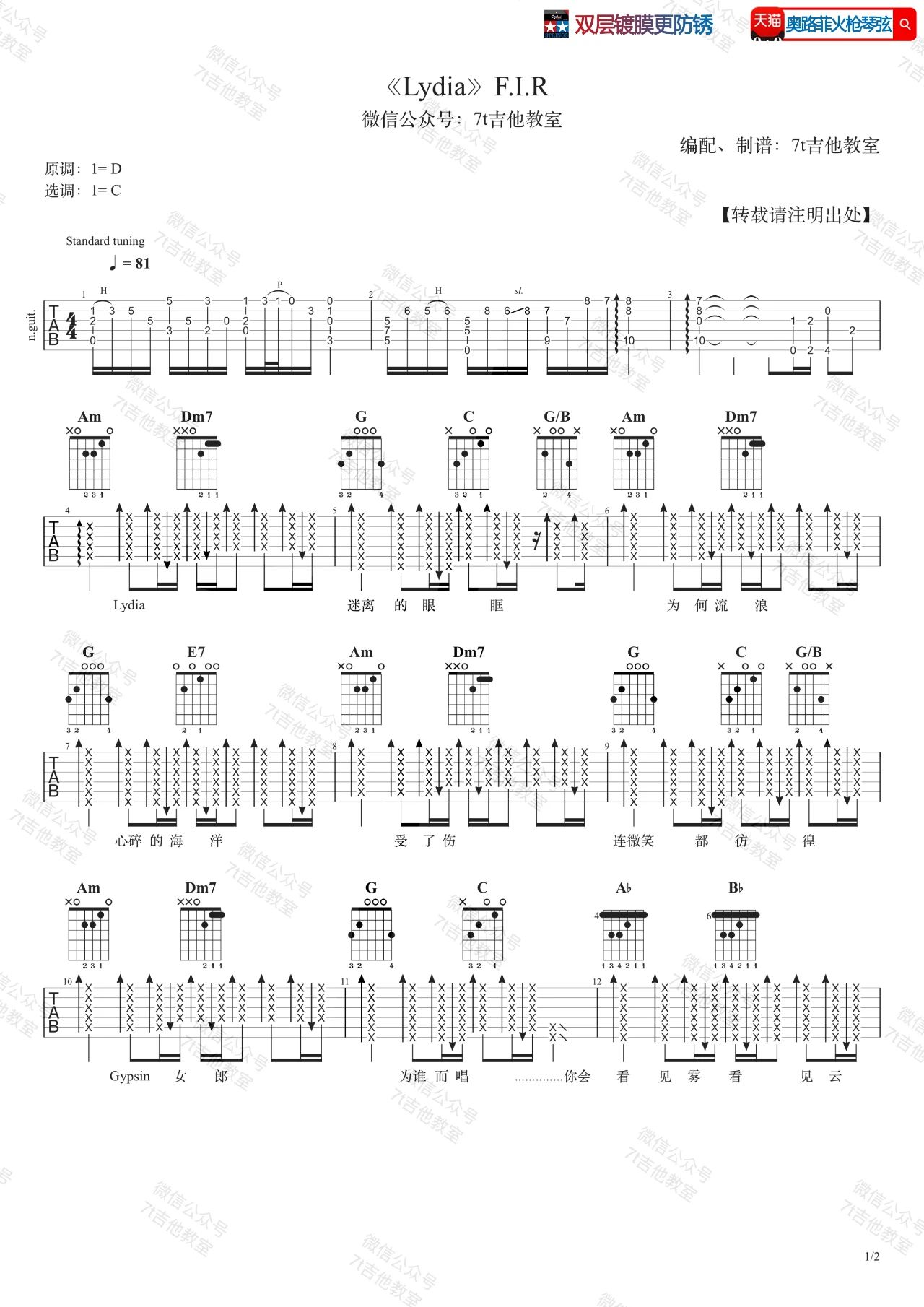 吉他F.I.R《Lydia》吉他谱_吉他弹唱谱_7t吉他教室编配