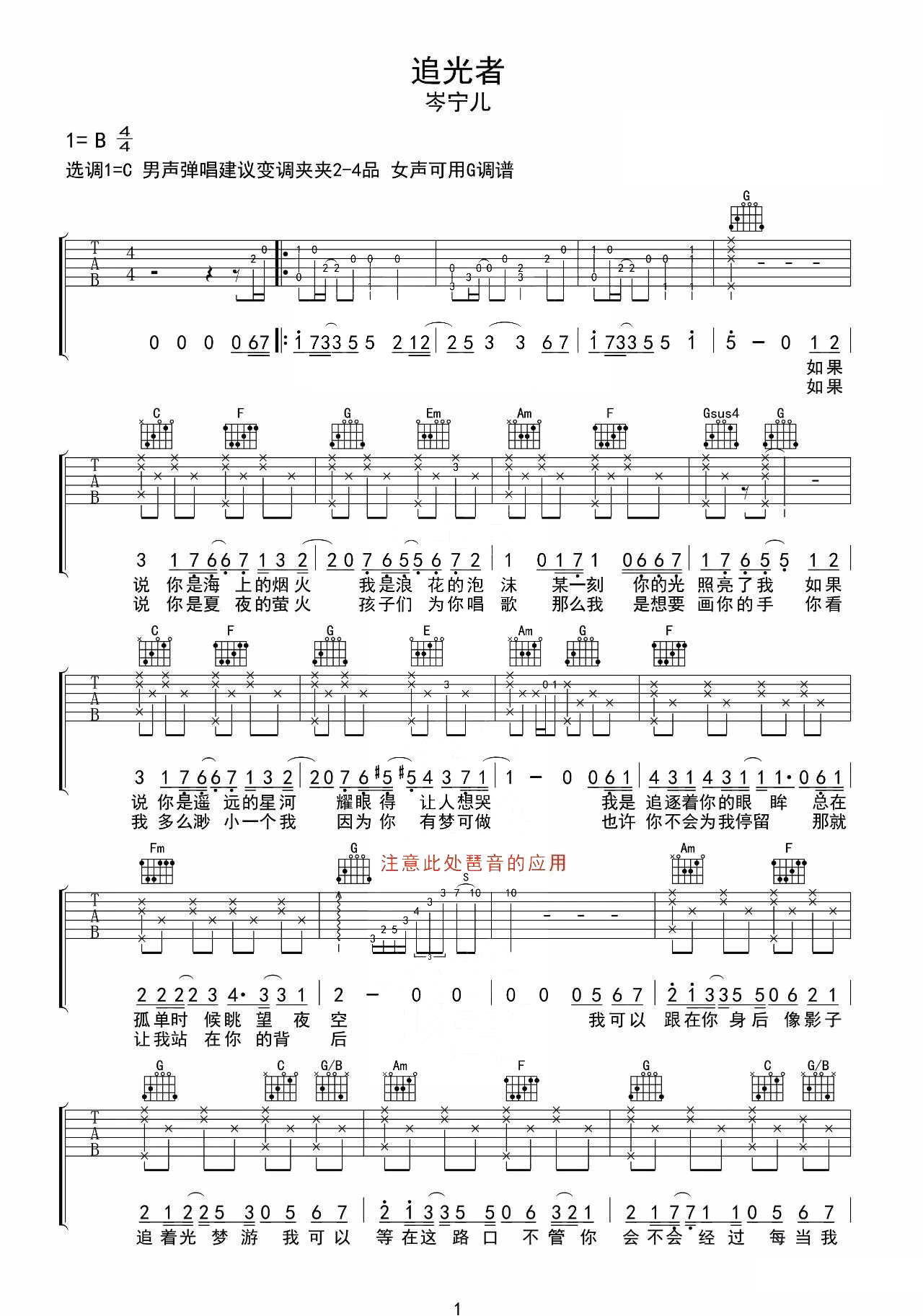 吉他岑宁儿《追光者》吉他谱_吉他弹唱谱_沈亮编配