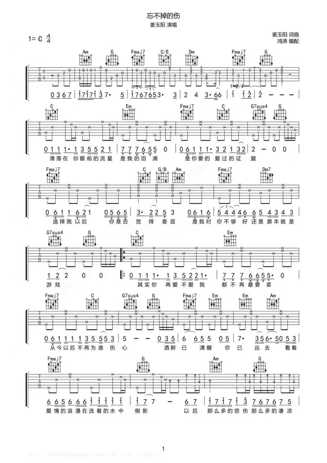 姜玉阳《忘不掉的伤》吉他谱,共有2张高清图谱,免翻页排版设计。...
