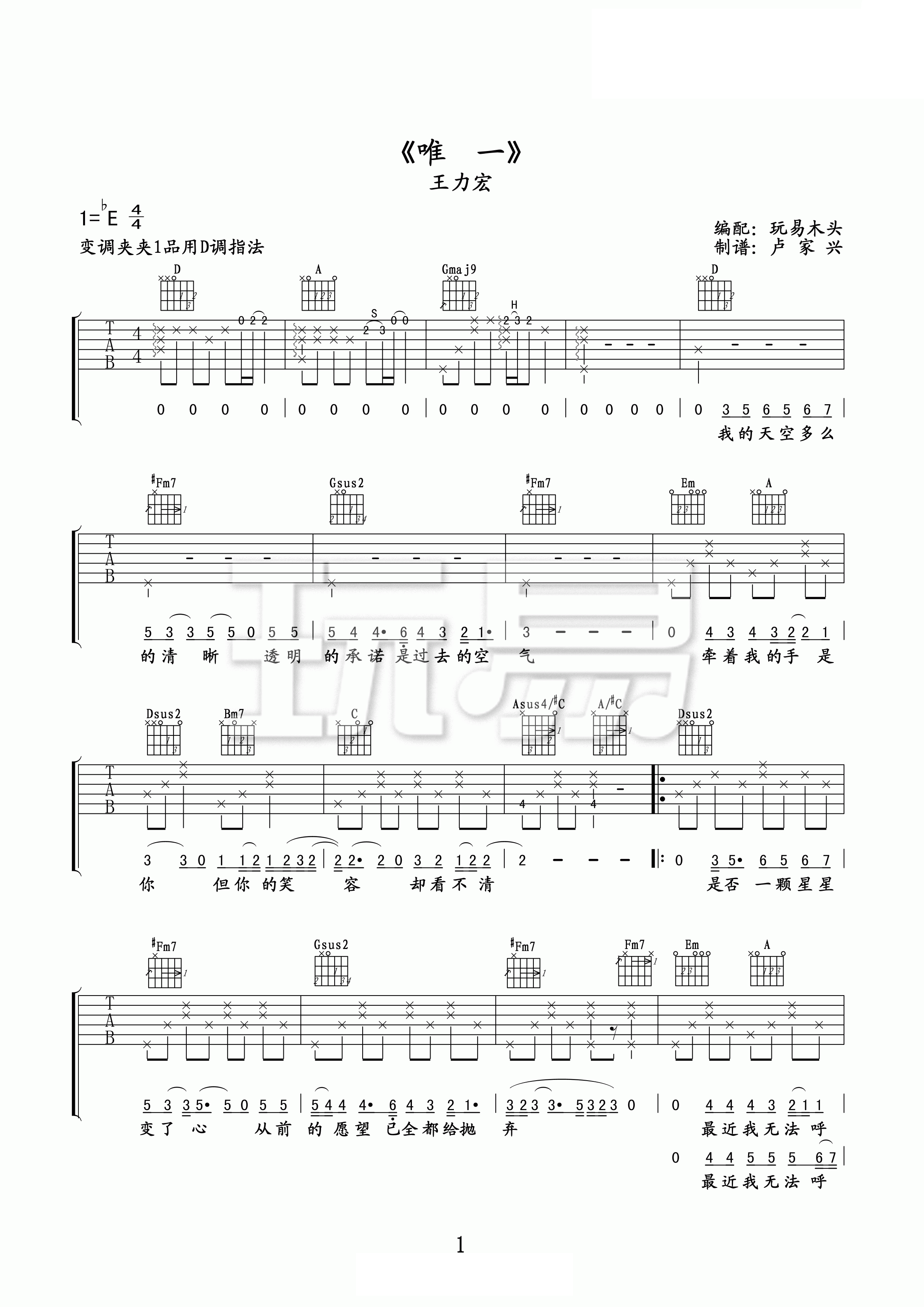 吉他王力宏《唯一》吉他谱_吉他弹唱谱_玩易吉他编配