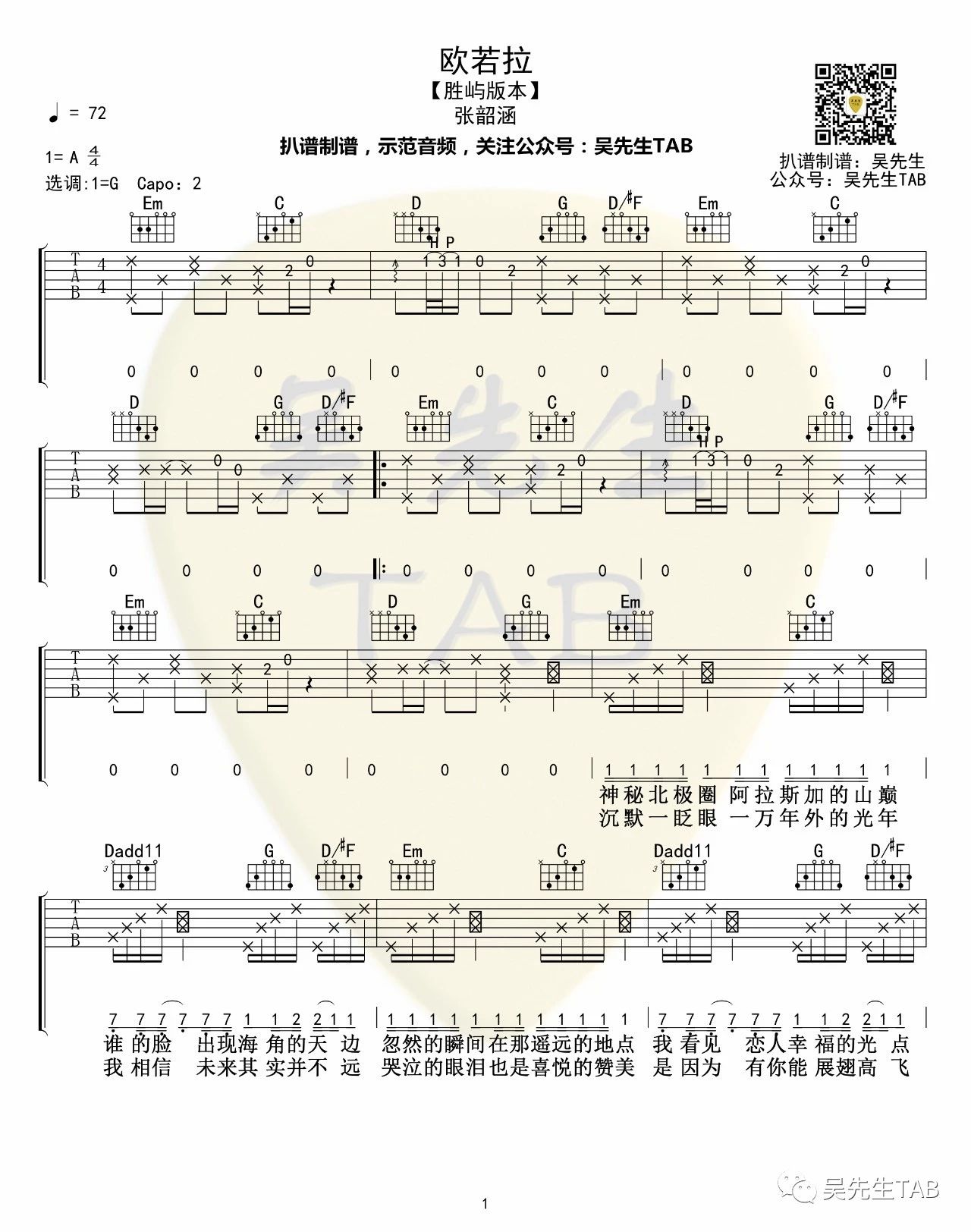 吉他张韶涵《欧若拉》吉他谱_吉他弹唱谱_吴先生编配