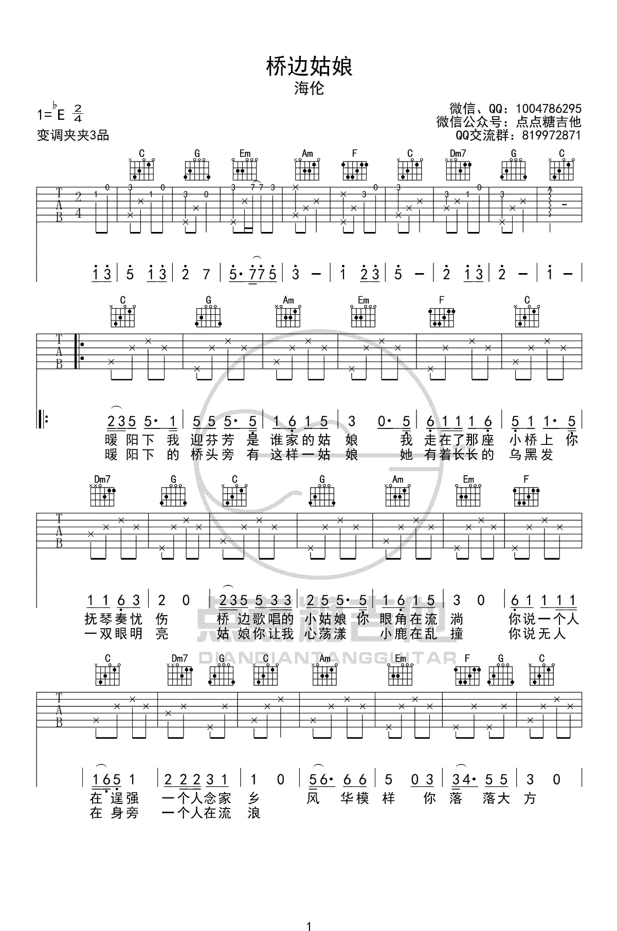 吉他海伦《桥边姑娘》吉他谱_吉他弹唱谱_点点糖吉他编配