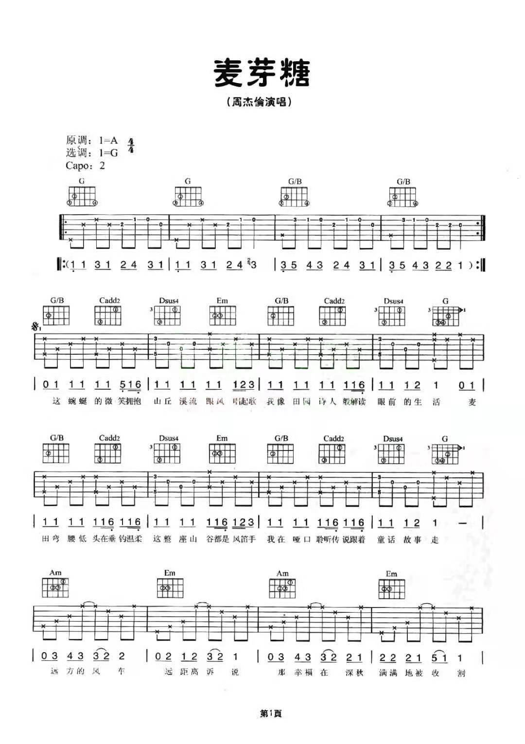 吉他周杰伦《麦芽糖》吉他谱_吉他弹唱谱