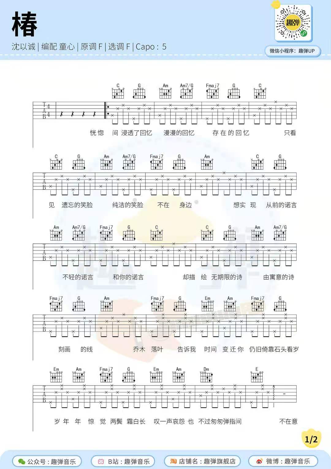 沈以诚《椿》吉他谱,共有2张高清图谱,免翻页排版设计。...
