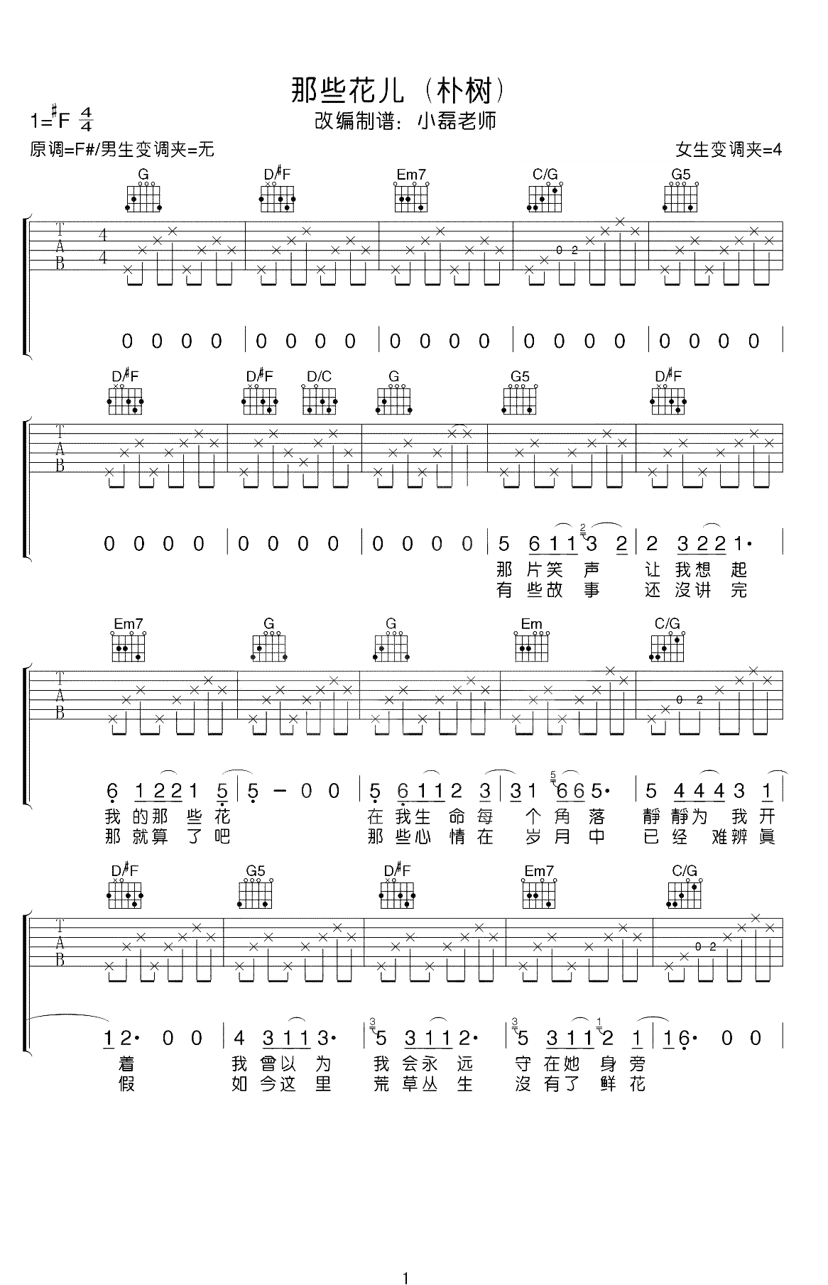 吉他朴树《那些花儿》吉他谱_吉他弹唱谱_小磊吉他编配
