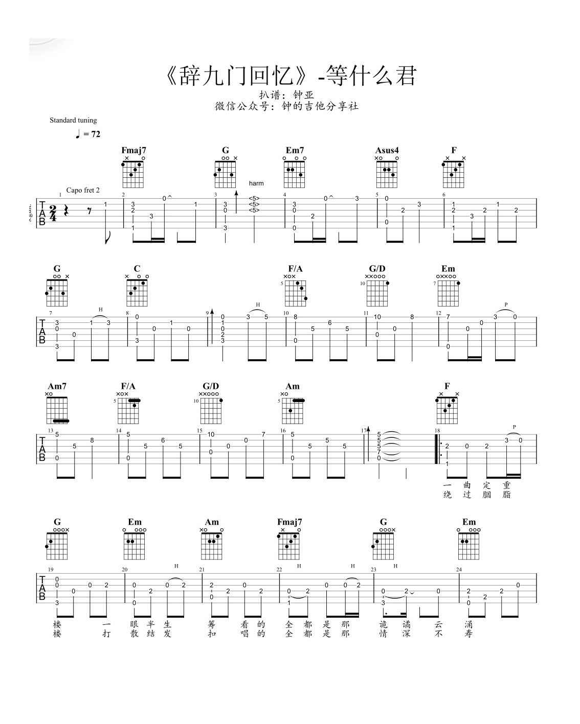 等什么君《辞九门回忆》吉他谱,钟的吉他社编配出品,共有3张高清图谱。...