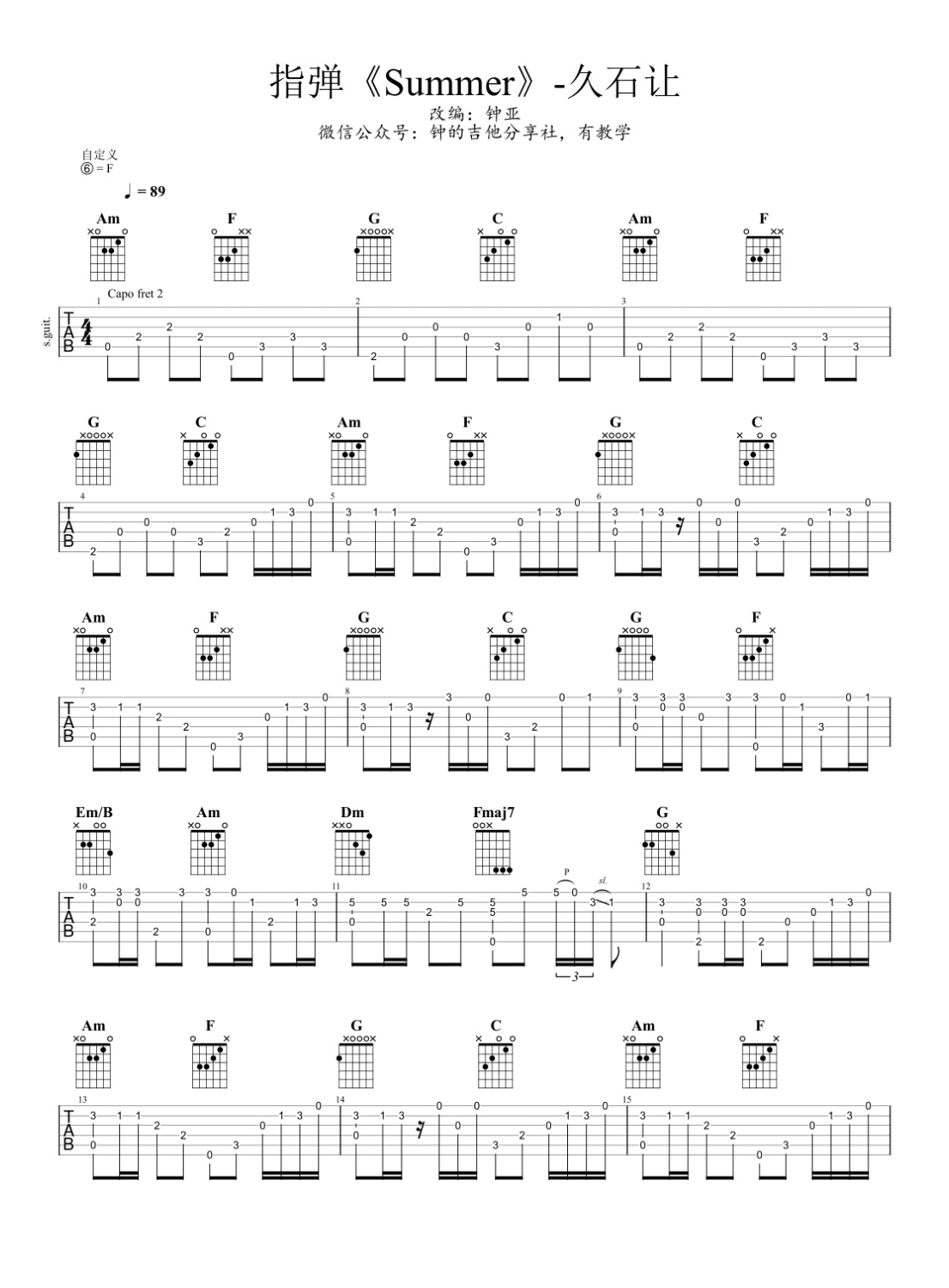 吉他久石让《summer》吉他谱_吉他指弹六线谱_钟亚编配