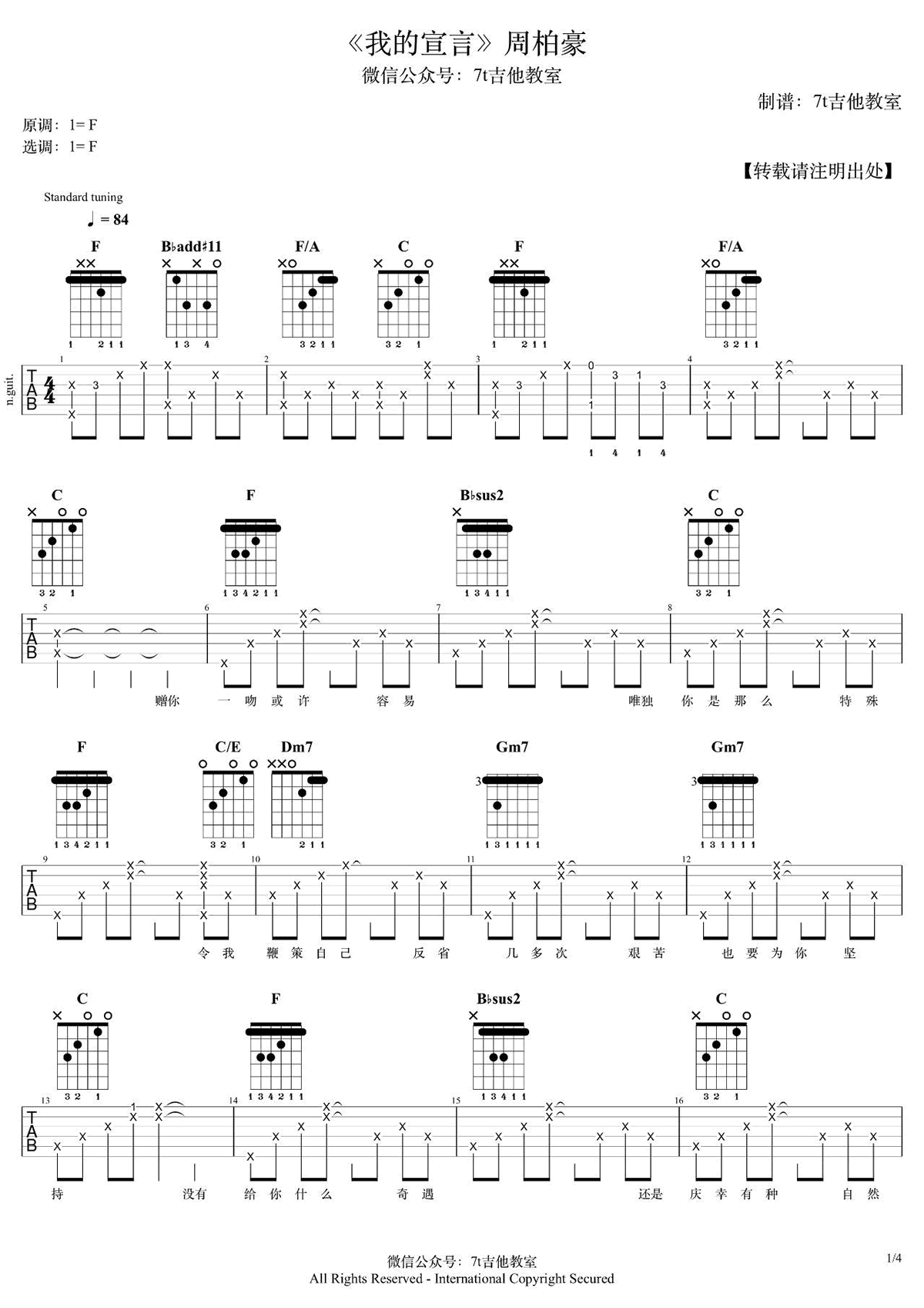 吉他周柏豪《我的宣言》吉他谱_吉他弹唱谱_7T吉他教室编配