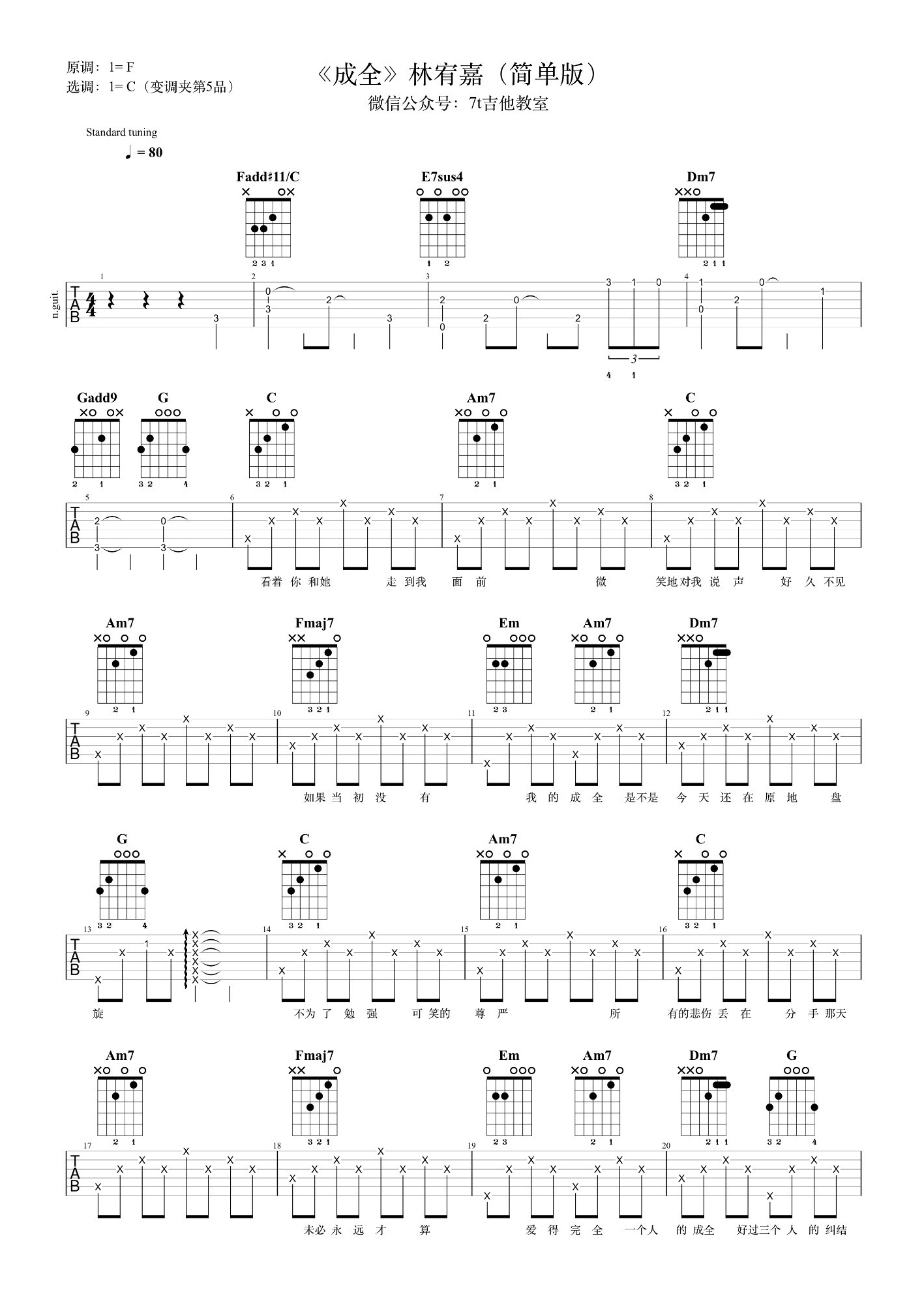 吉他林宥嘉《成全》吉他谱_吉他弹唱谱_7T音乐教教室编配