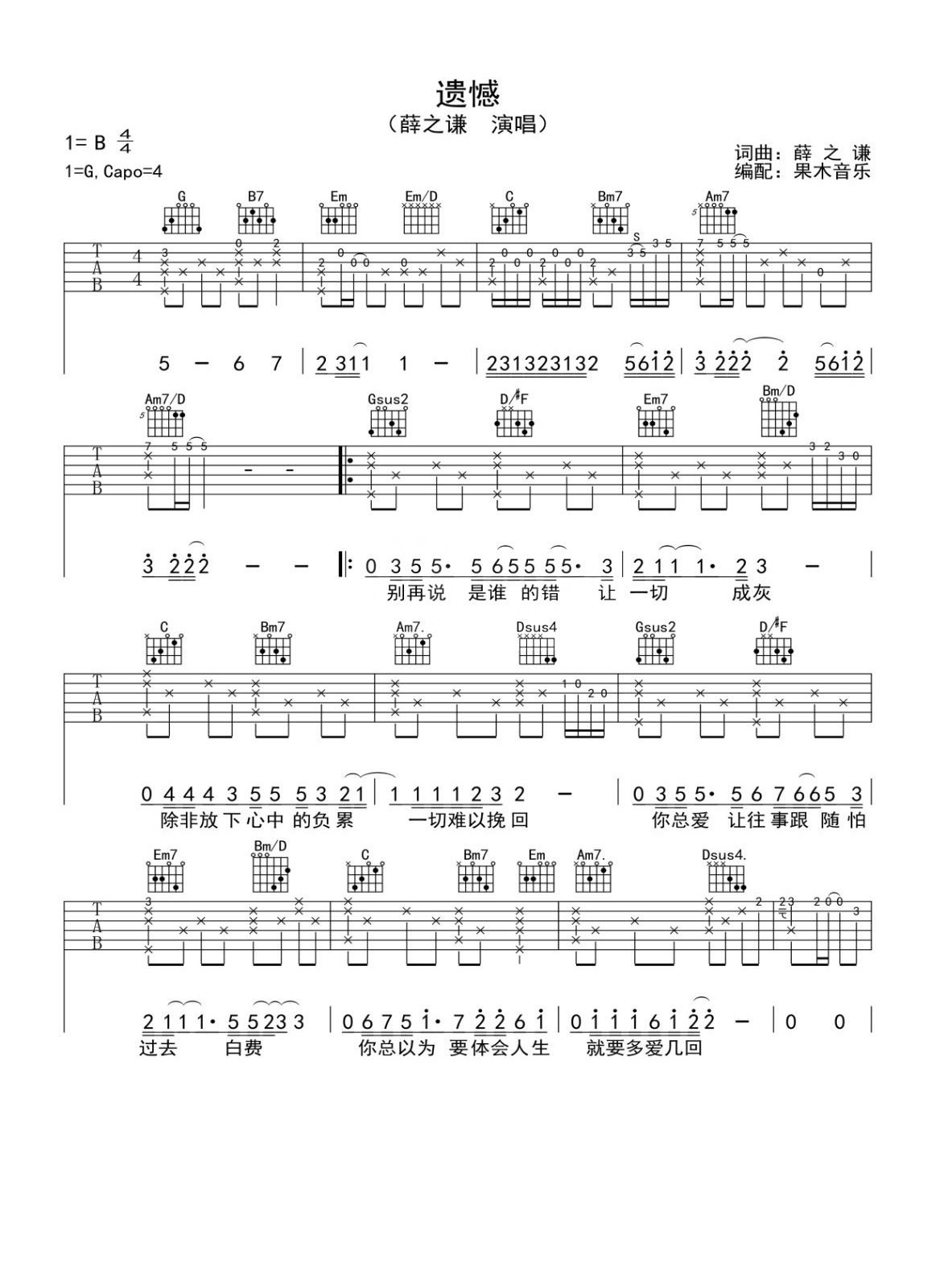 吉他薛之谦《遗憾》吉他谱_吉他弹唱谱_果木音乐编配