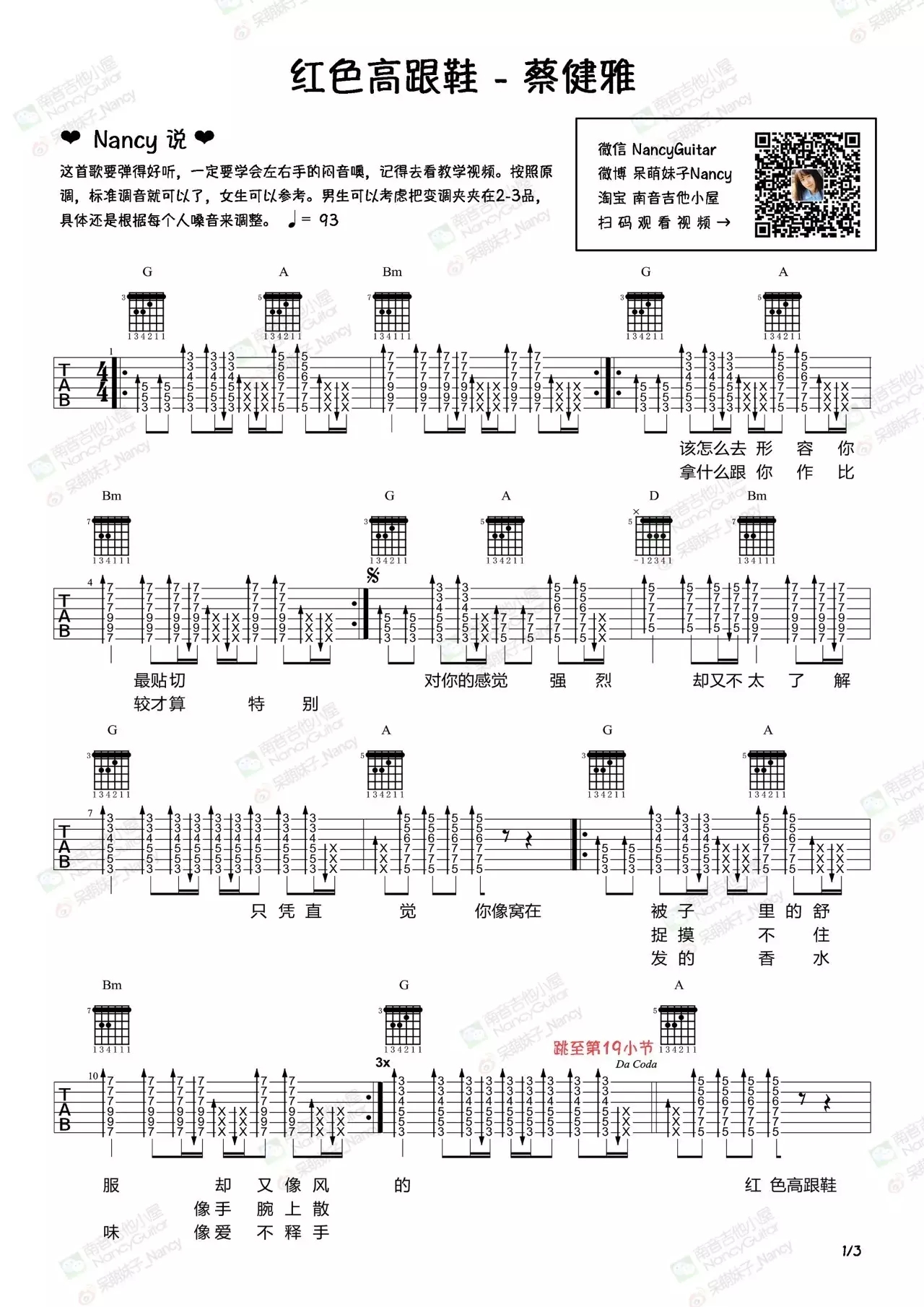 蔡健雅《红色高跟鞋》吉他谱,南音吉他编配出品,共有3张高清图谱。...