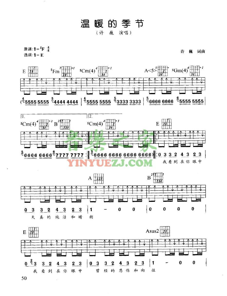吉他许巍《温暖的季节》吉他谱_吉他弹唱谱_YYZJ编配