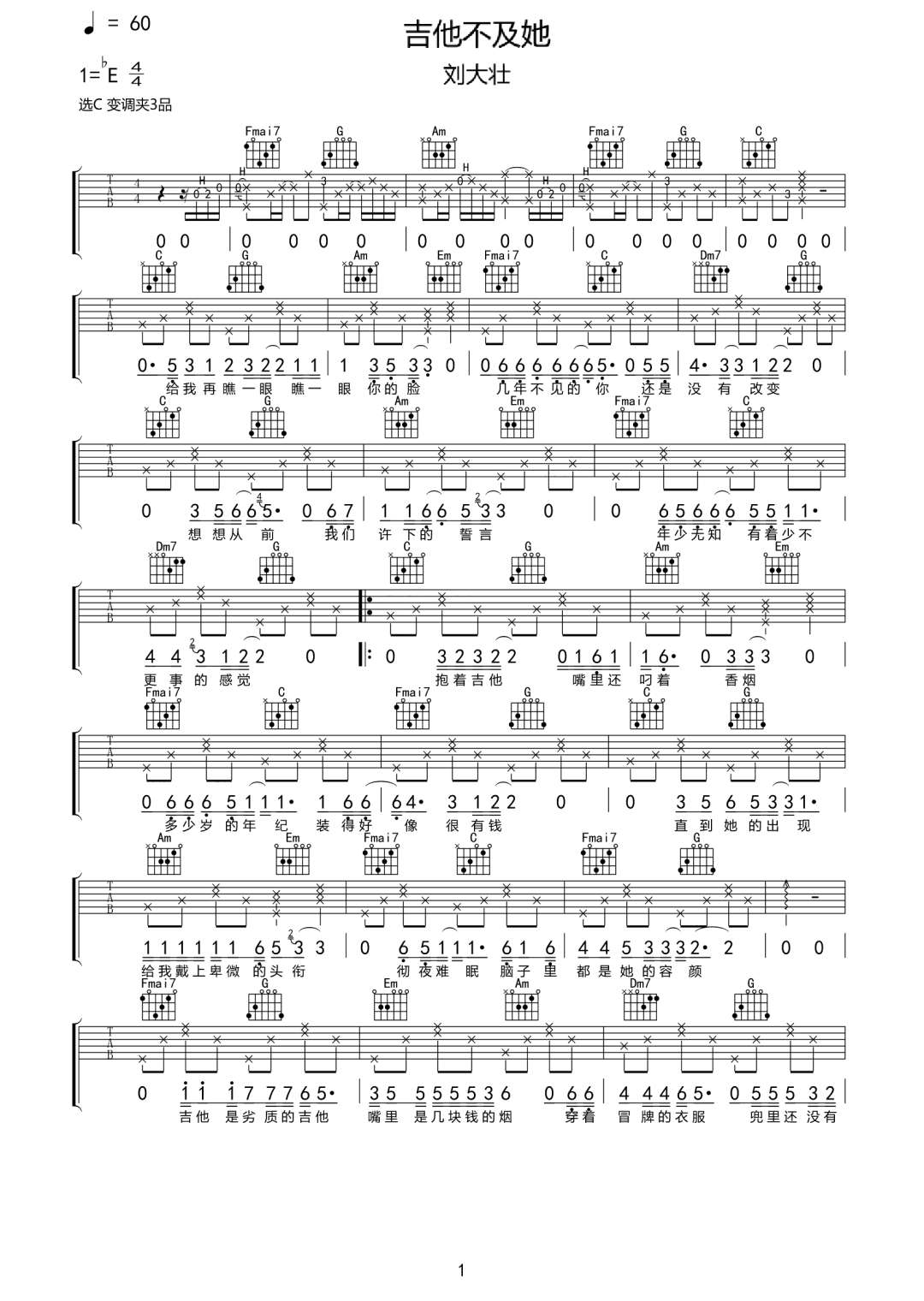 吉他刘大壮《吉他不及她》吉他谱_吉他弹唱谱