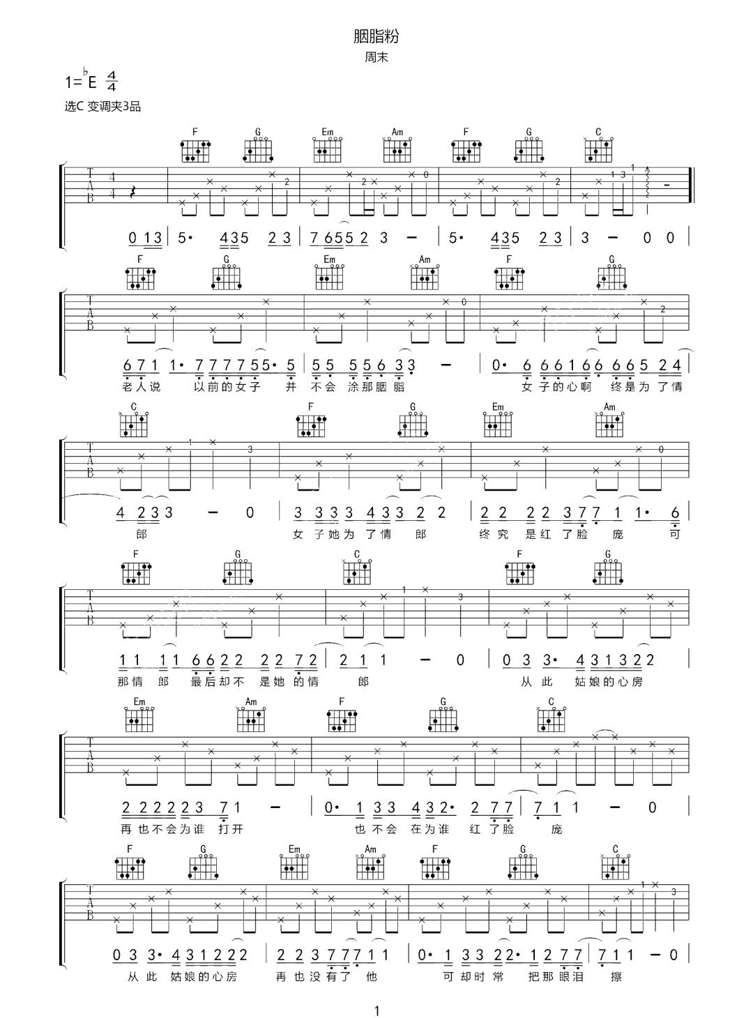 周末《胭脂粉》吉他谱,共有4张高清图谱。...