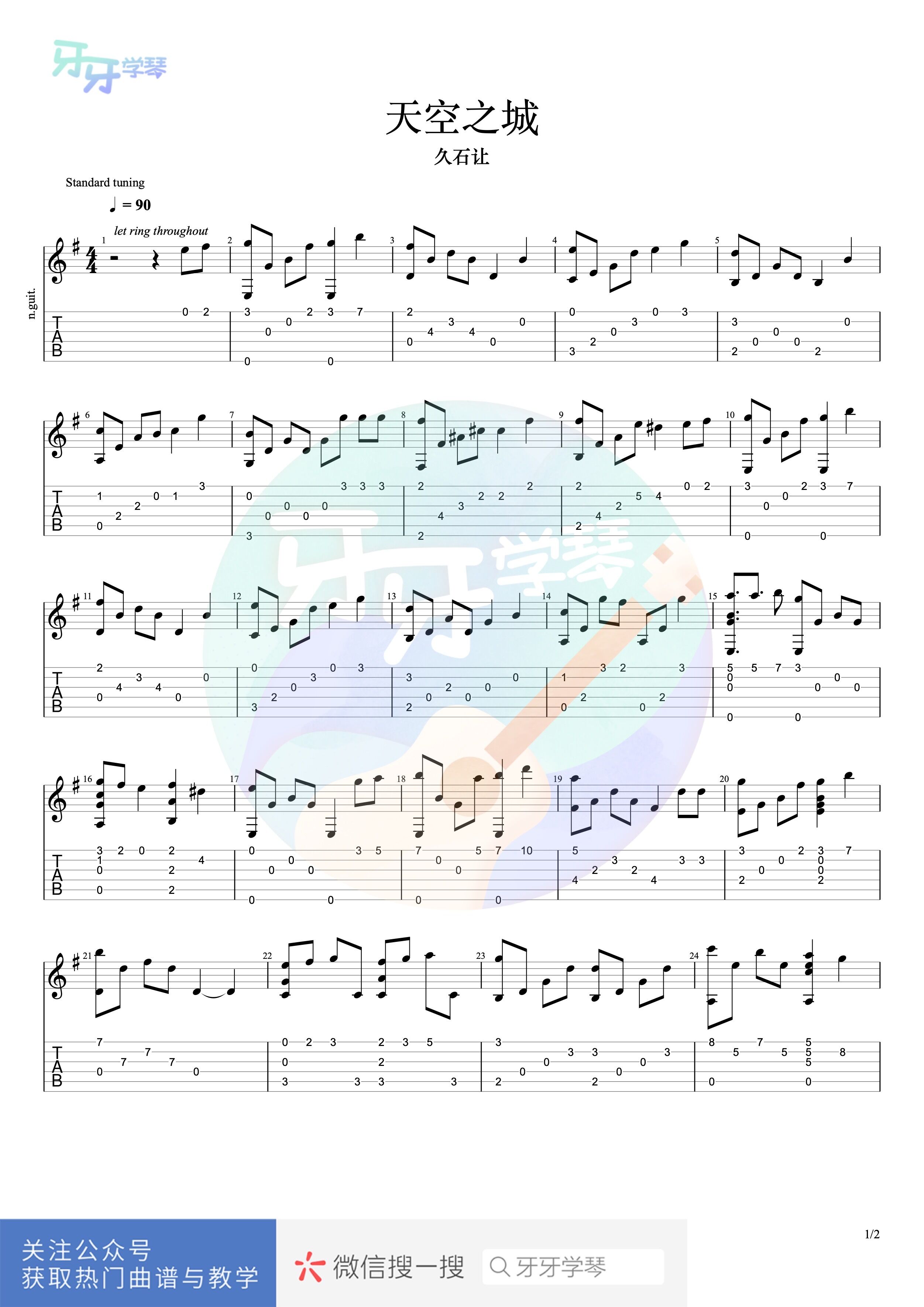 久石让《天空之城》吉他谱,共有2张高清图谱,免翻页排版设计。...