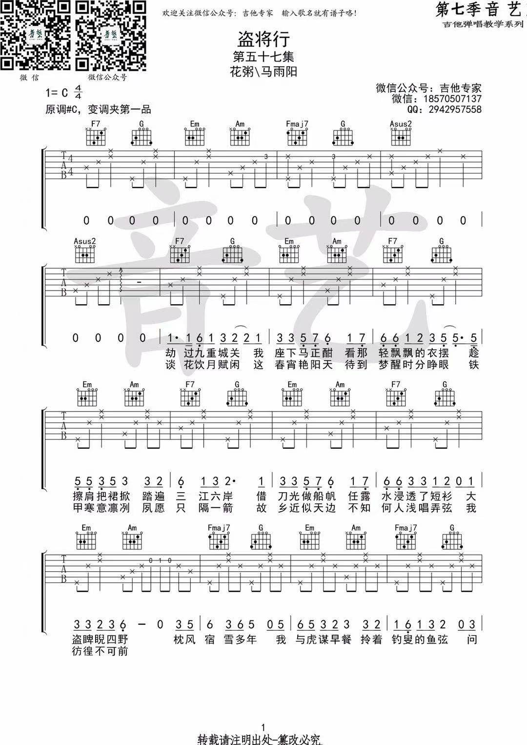吉他花粥&马雨阳《盗将行》吉他谱_吉他弹唱谱_音艺吉他编配