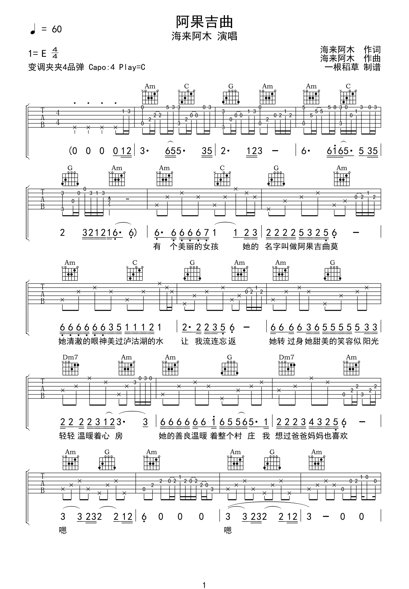 海来阿木《阿果吉曲》吉他谱,一根稻草编配出品,共有3张高清图谱。...
