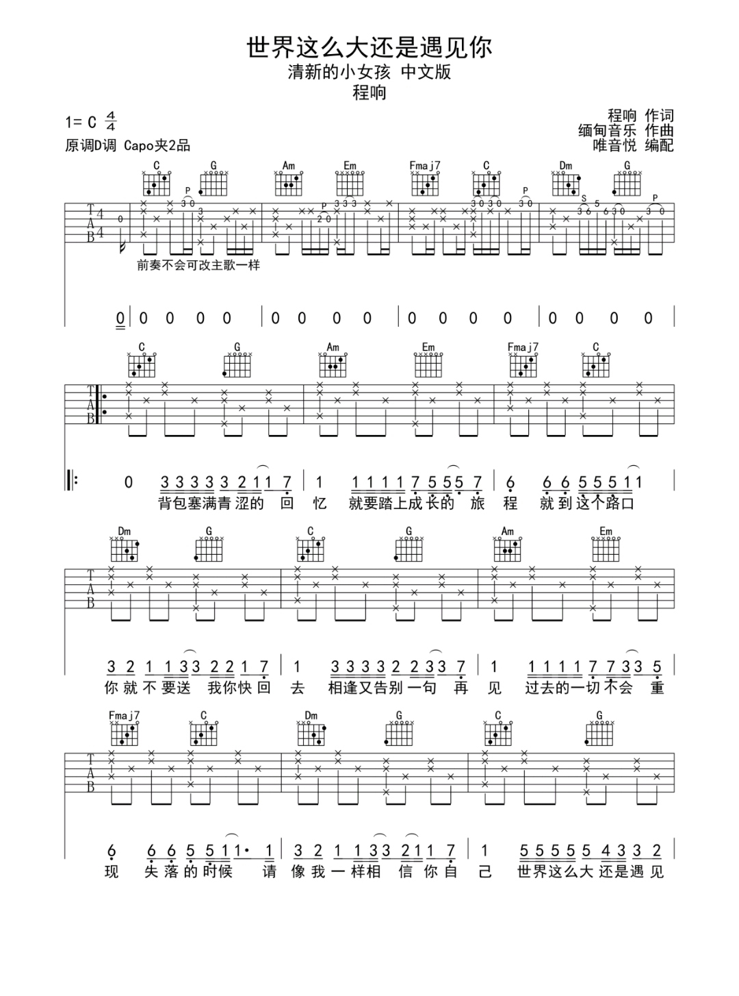 程响《世界这么大还是遇见你》吉他谱,唯音悦编配出品,共有2张高清图谱,免翻页排版设计。...