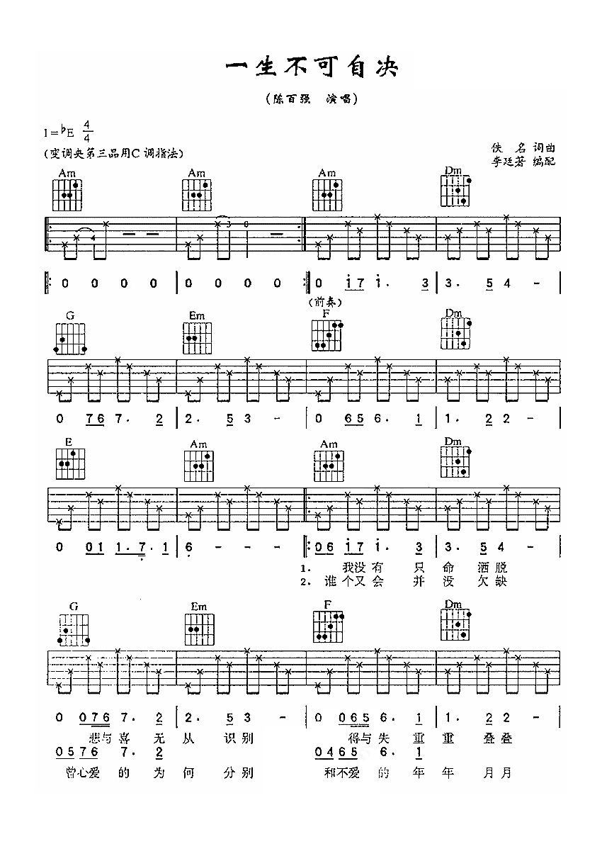 吉他陈百强《一生不可自決》吉他谱_吉他弹唱谱