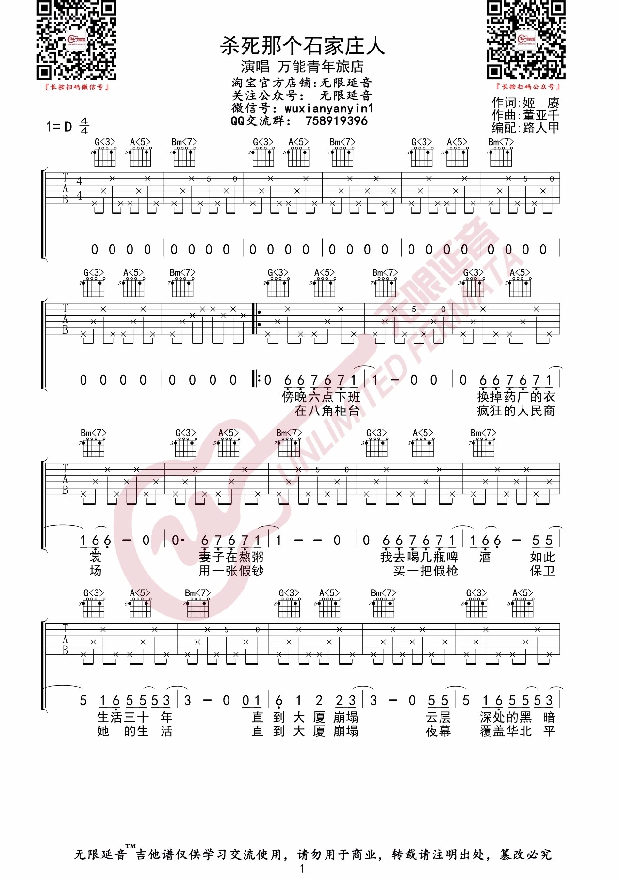 吉他万能青年旅馆《杀死那个石家庄人》吉他谱_吉他弹唱谱_无限延音编配