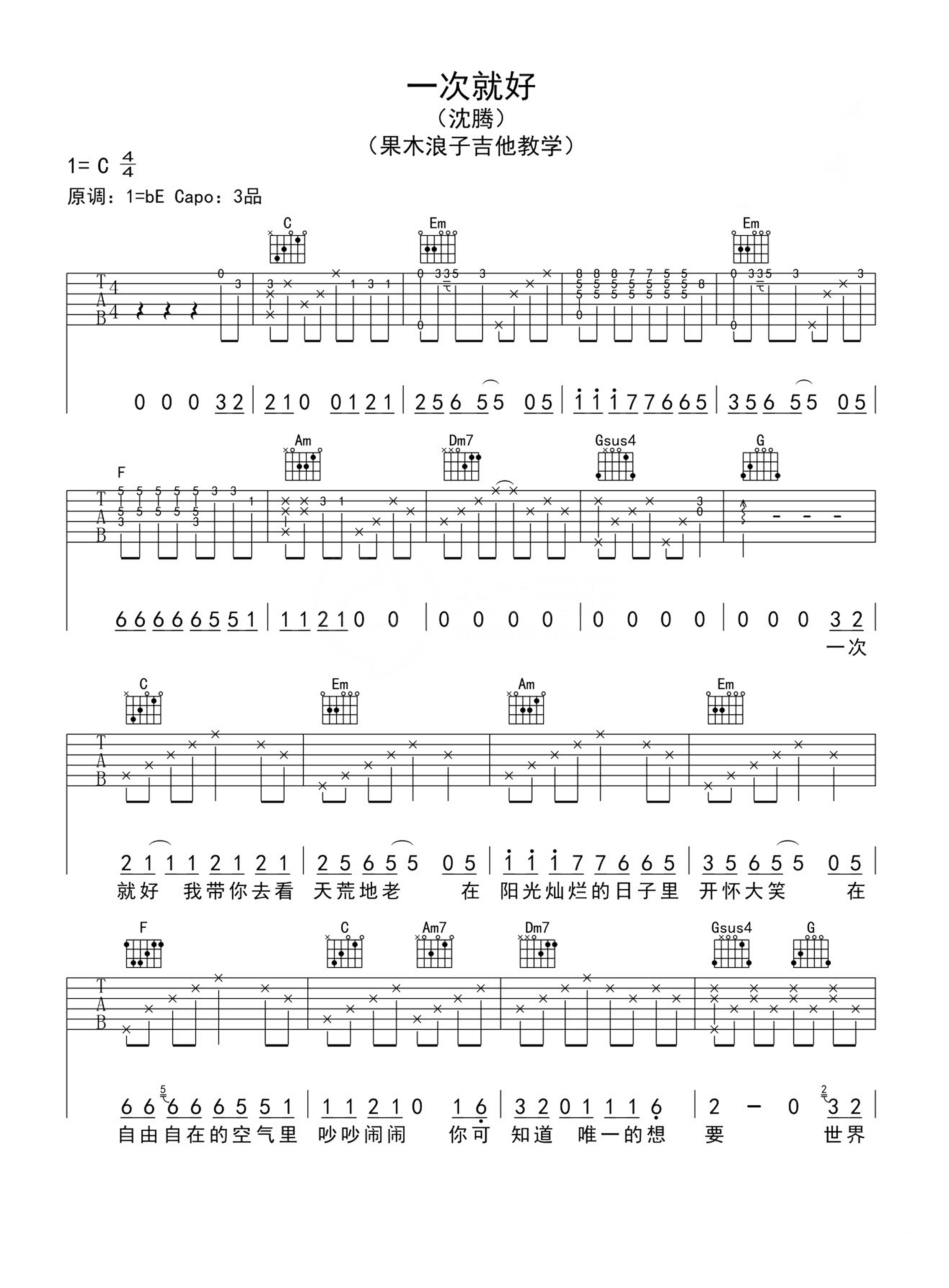 吉他沈腾《一次就好》吉他谱_吉他弹唱谱_果木音乐编配