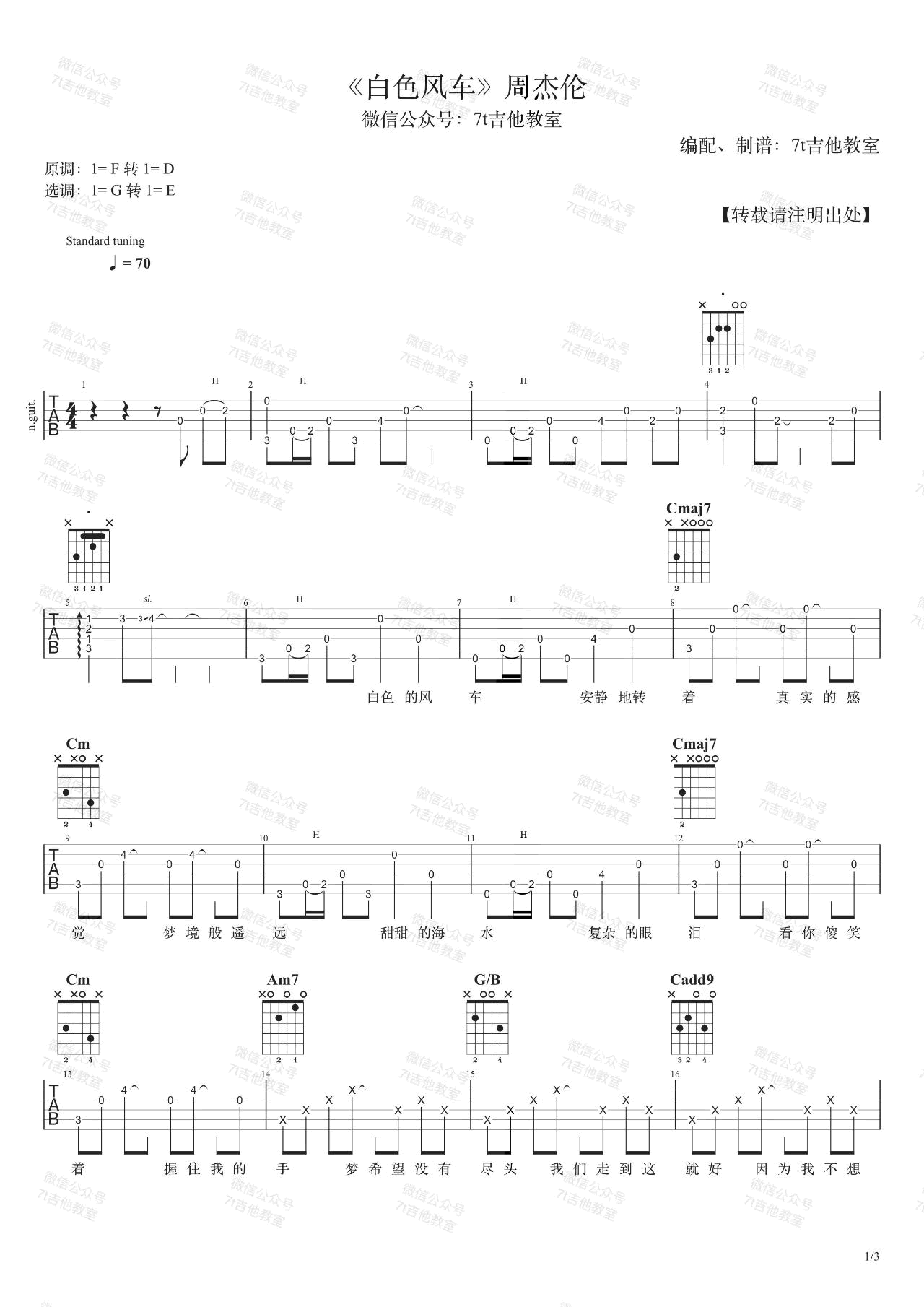 吉他周杰伦《白色风车》吉他谱_吉他弹唱谱_7T吉他教室编配
