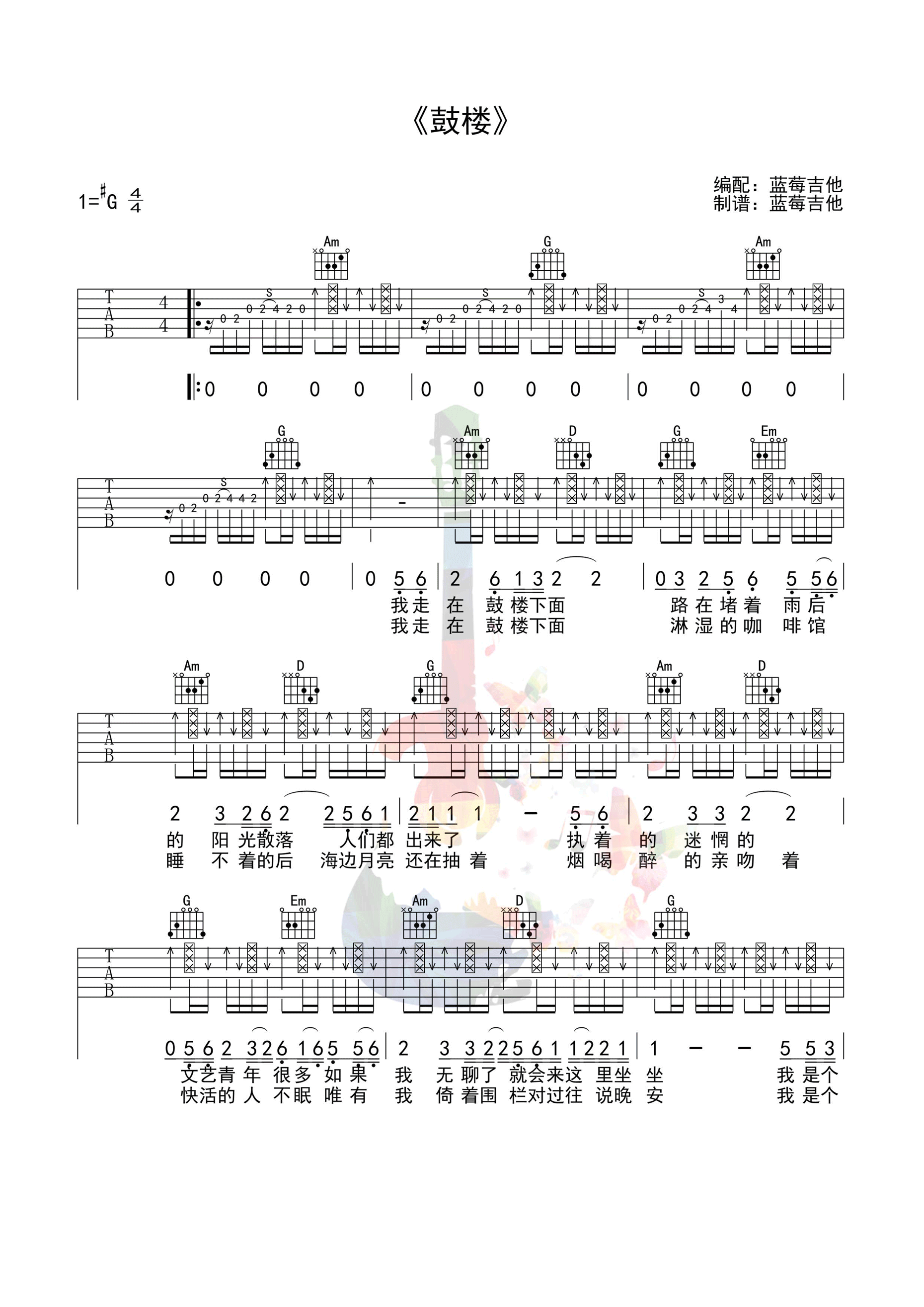 赵雷《鼓楼》吉他谱,蓝莓吉他编配出品,共有2张高清图谱,免翻页排版设计。...